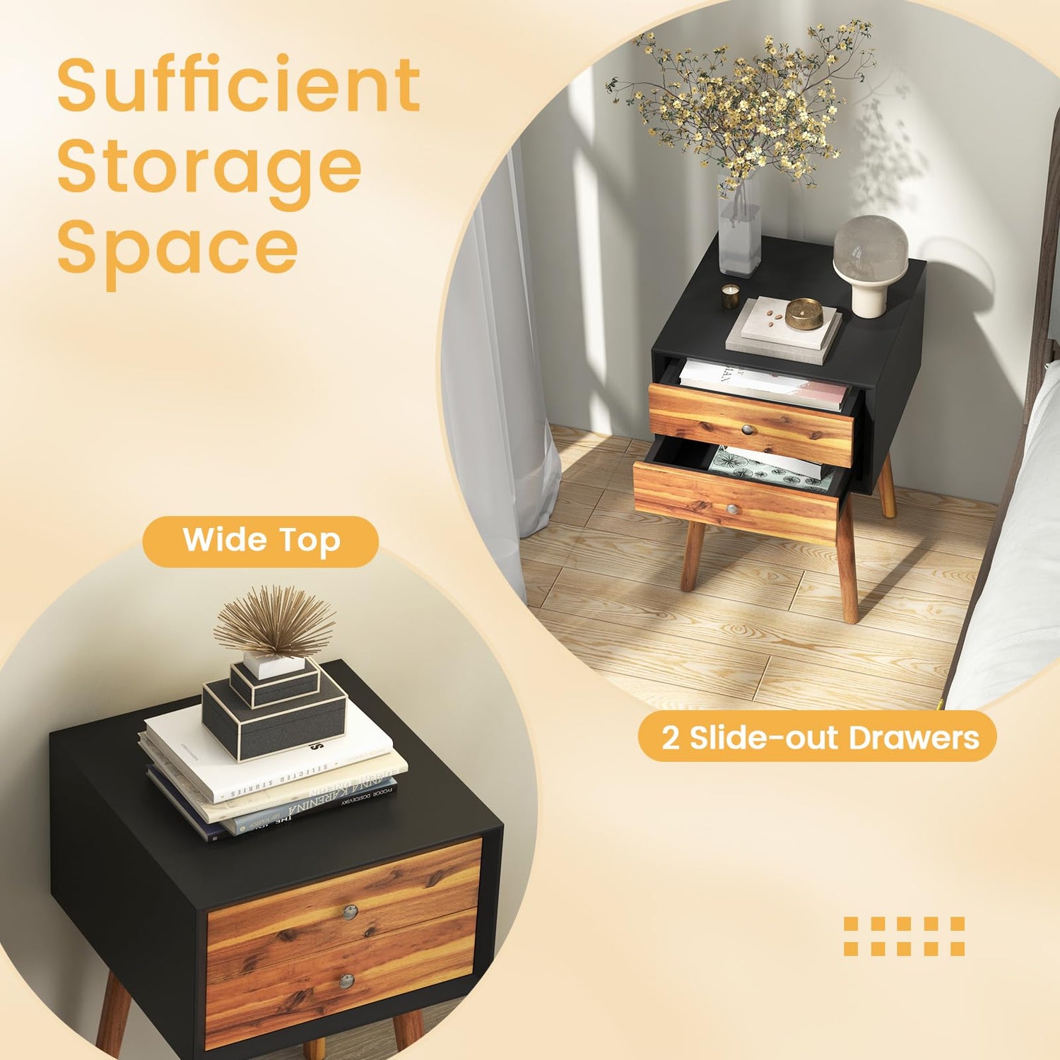 Giantex Nightstand with 2 Drawers, Mid Century Modern Bedside Table with Solid Wood Legs, Practical End Side Table for Living Room Bedroom Small Space, Night Stand, Black & Walnut