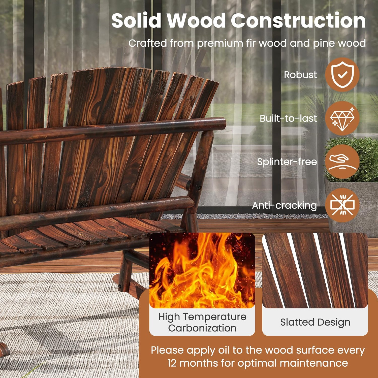 - [Robust Solid Wood Construction]: Crafted from premium fir wood and pine wood that undergoes a high-temperature carbonization process for enhanced robustness, the Adirondack porch rocker is built to last. Please apply oil to the wood surface every 12 months for optimal maintenance.
