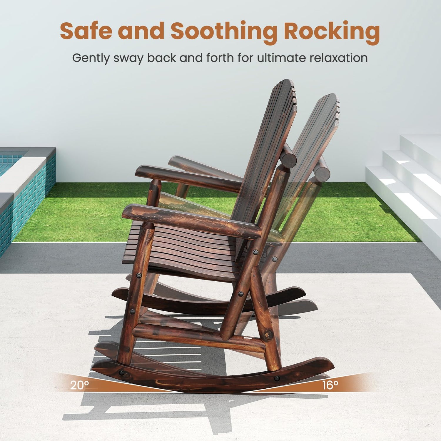 - [Ergonomic Comfort]: Featuring a high backrest, spacious contoured seat, and comfortable armrests, our log rocker supports and cradles your body, offering a cozy seating experience. The slatted seat design promotes airflow, making it a cool retreat even on warm summer days.