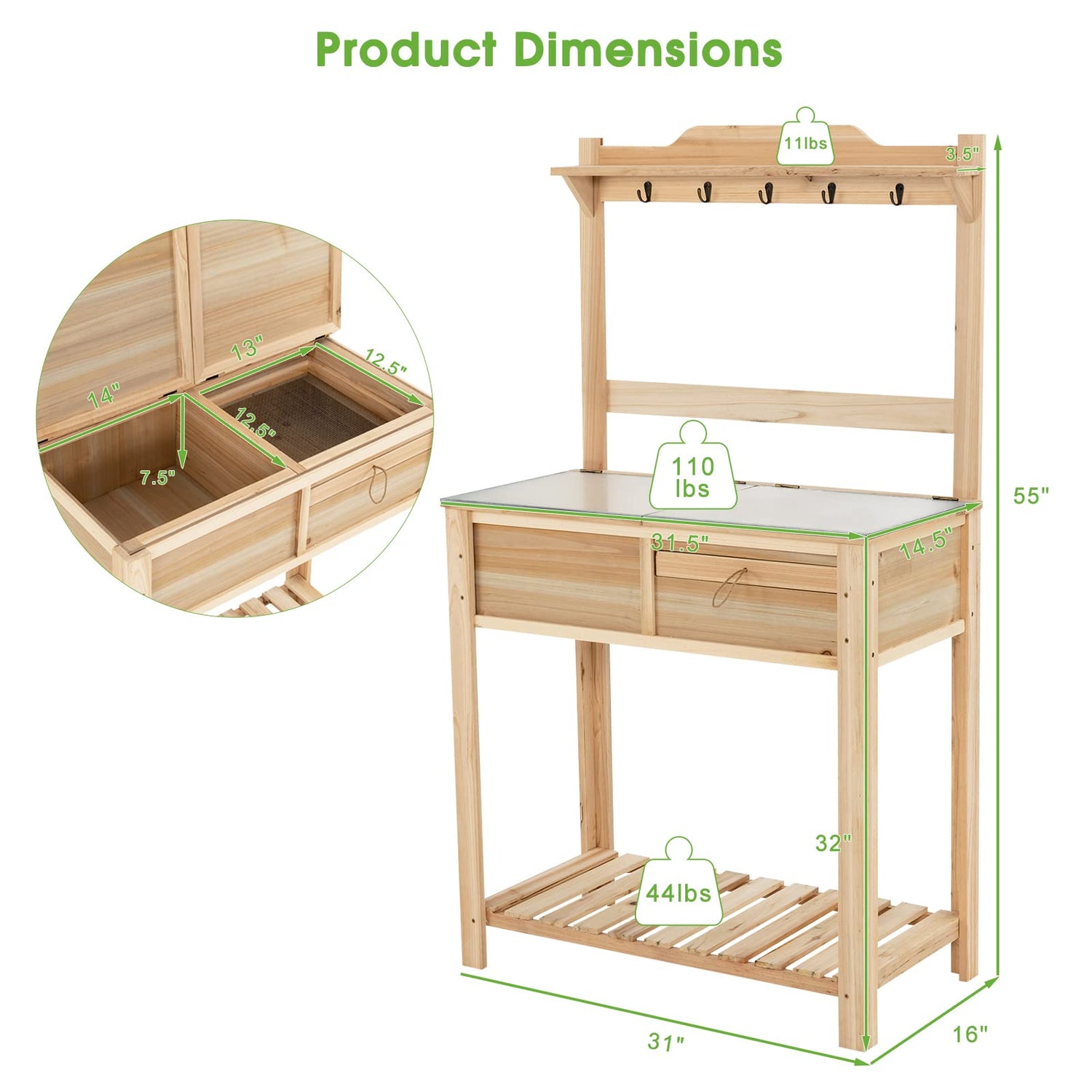 - Functional & Ergonomic Potting Bench: This multi-use potting bench can be used for gardening tools storage, potted plants display, garden works preparation and more, which makes it a great addition to your space. With the tabletop height of 32"/81.5 cm, this potting bench will avoid bending down or leaning over during gardening.