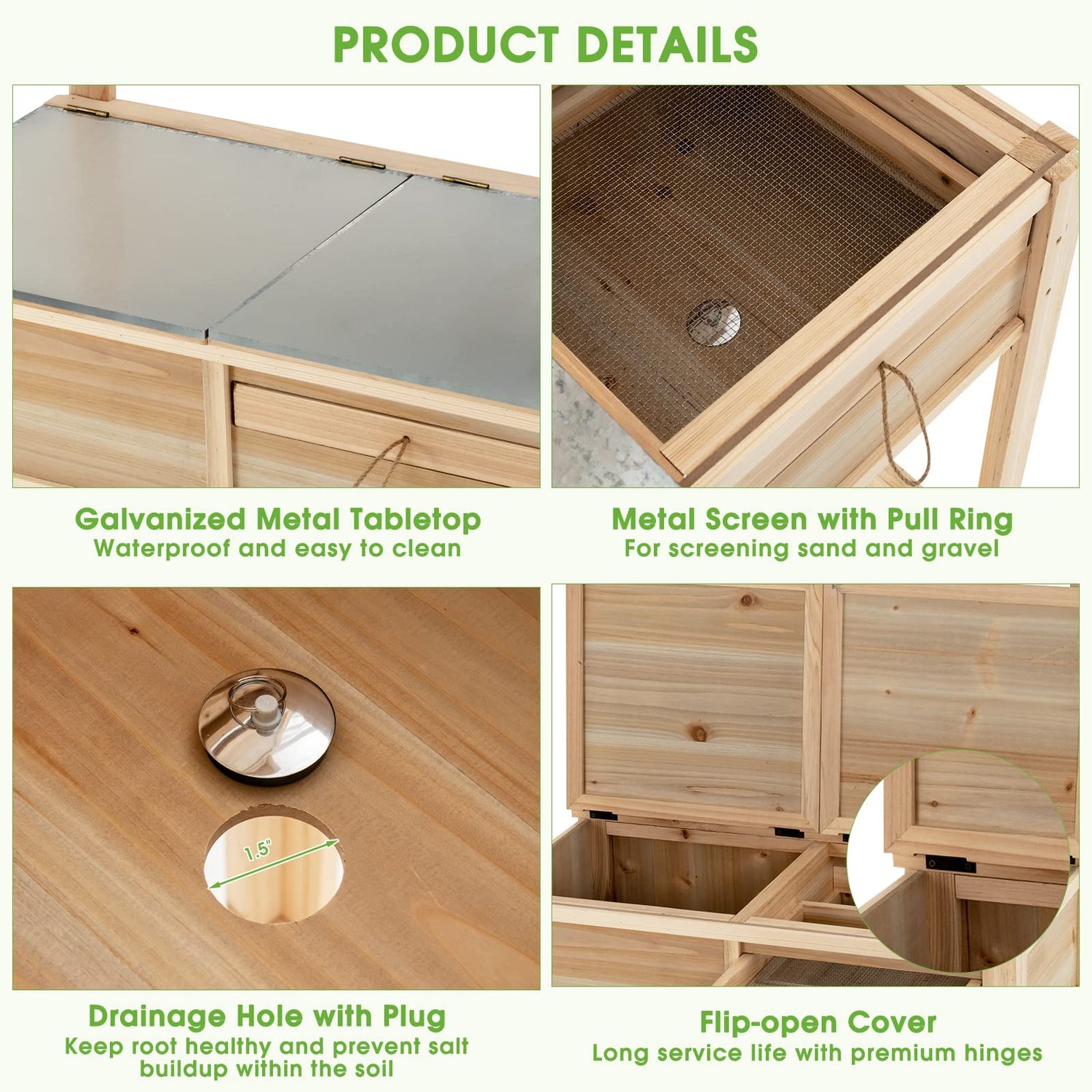- Built in Plating Box & Metal Screen: This outdoor gardening station is built with a planting box measuring 13" x 12.5" x 7.5"/33 cm x 31.5 cm x 19.5 cm (L x W x H), which provides ample growing space for most plants. Also, a matched plug is included for the drainage hole. And the metal screen is convenient for screening sand and gravel.