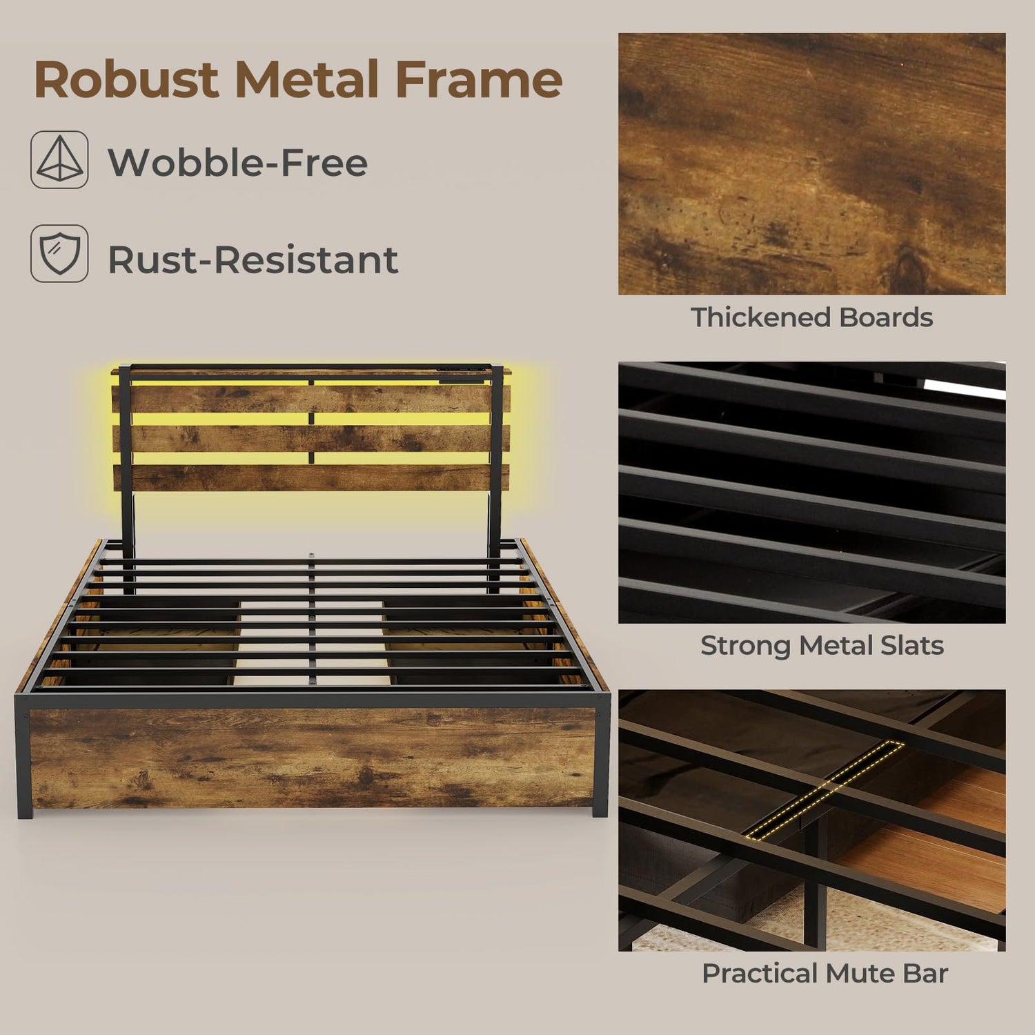 Stay connected and charged with the built-in power station. Featuring two integrated AC outlets and two high-capacity USB ports, this bed frame eliminates the hassle of messy cords and keeps your devices readily accessible, ensuring you’re always powered up.