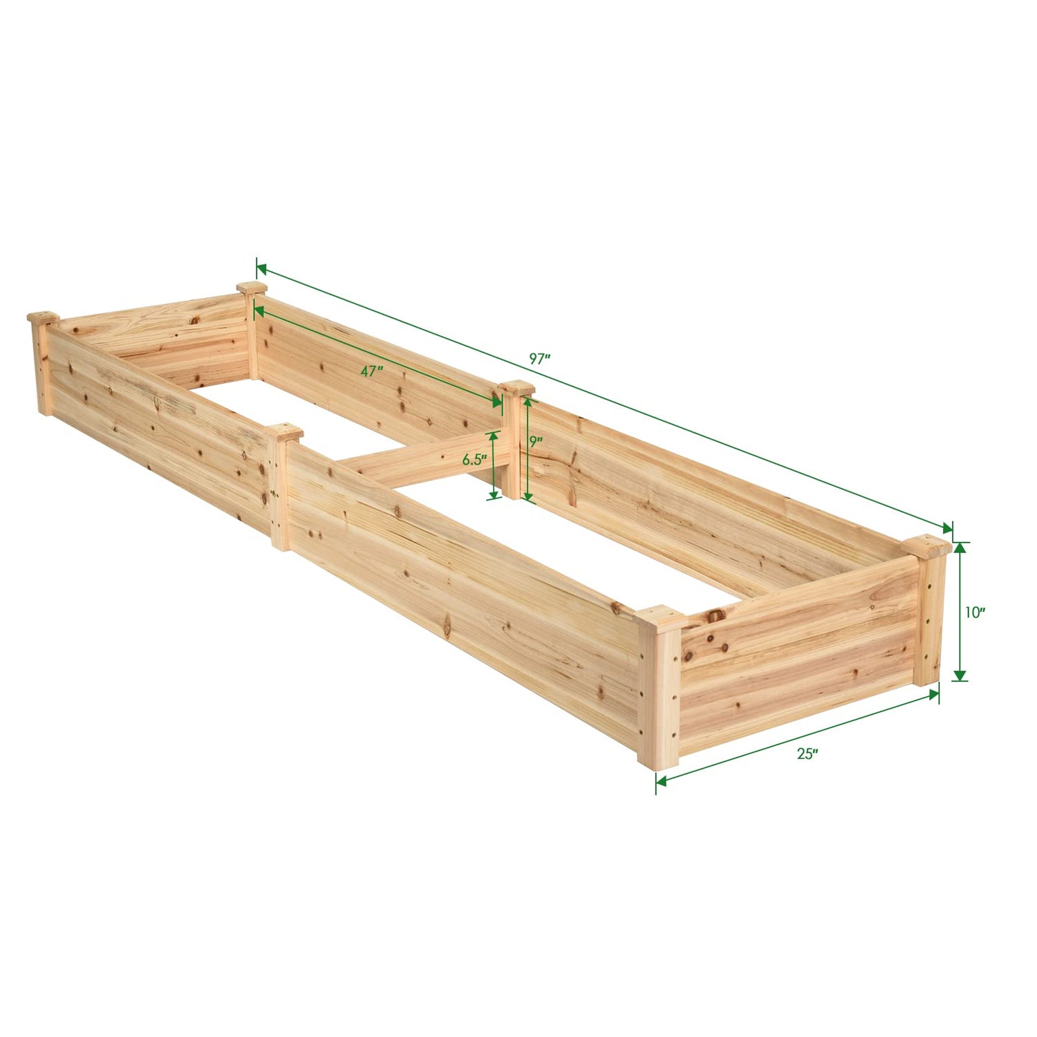 - 【Large Planter Boxes for Vegetable Flowers Growing】 - The storage space of this plant bed is ample enough to plant vegetables, herbs and flowers or some deep-rooted plant. Besides, it can kindly keep and maintain moisture for plant inside and two frames are good for classifying different plant and enable plants don’t affect with each other. The whole size of planter raised bed is 97"x 25"x 10" (L x W x H).