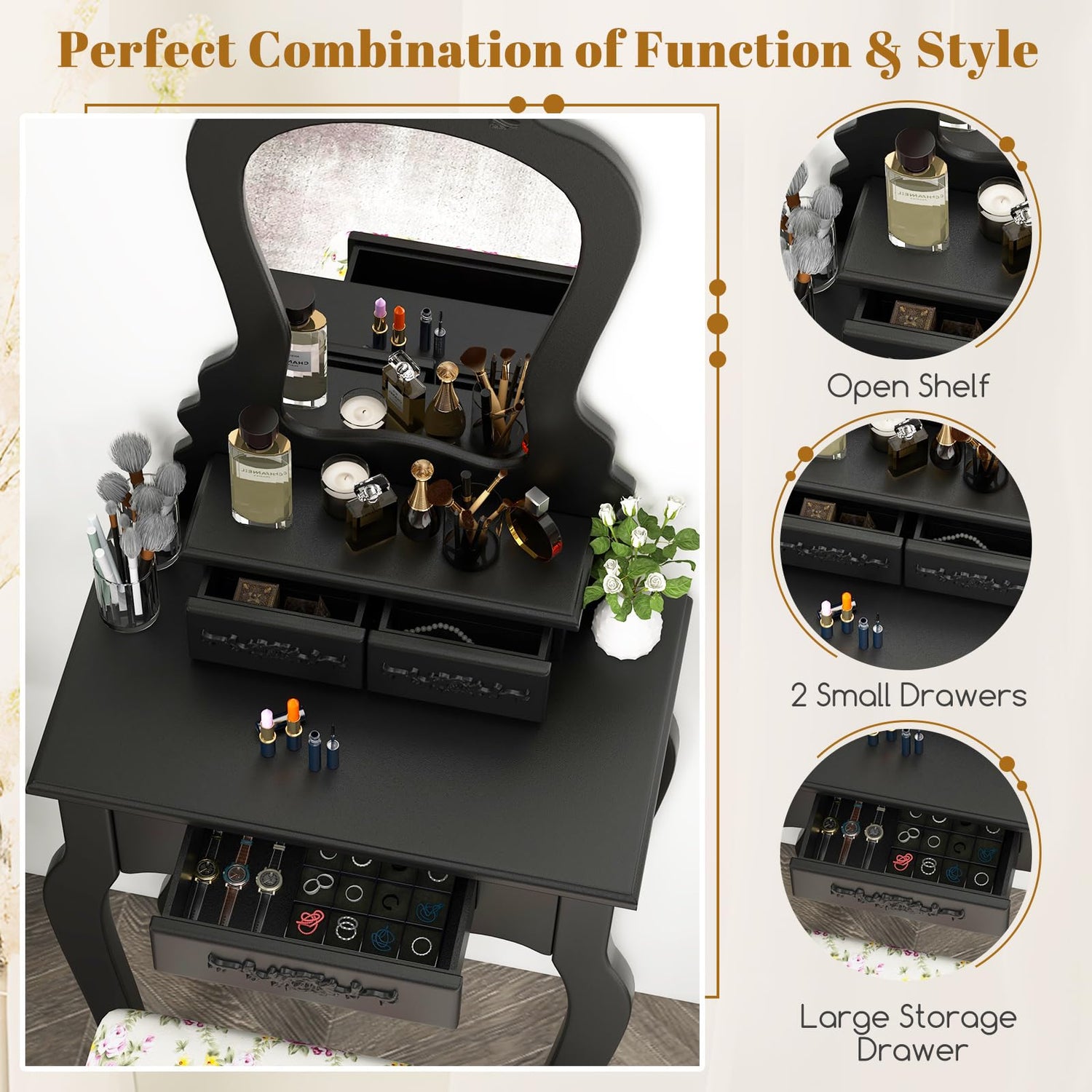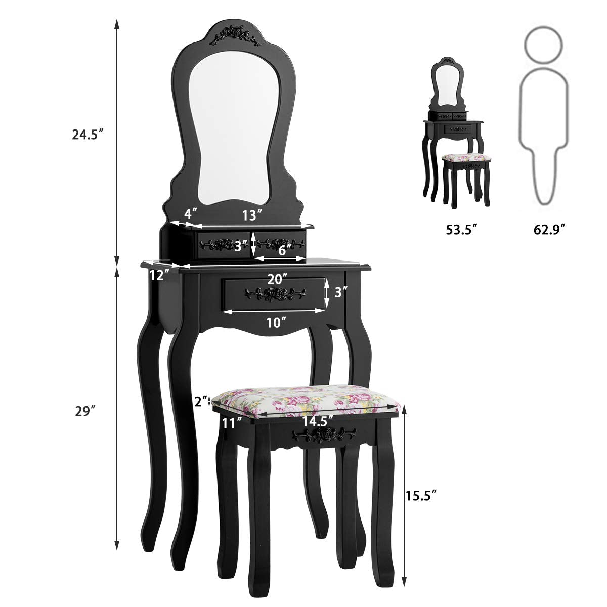 Giantex Small Vanity Desk Set, Black Makeup Vanity Table with Mirror, Cushioned Stool, 3 Storage Drawers, 20 inch Girls Dressing Table for Small Space Bedroom