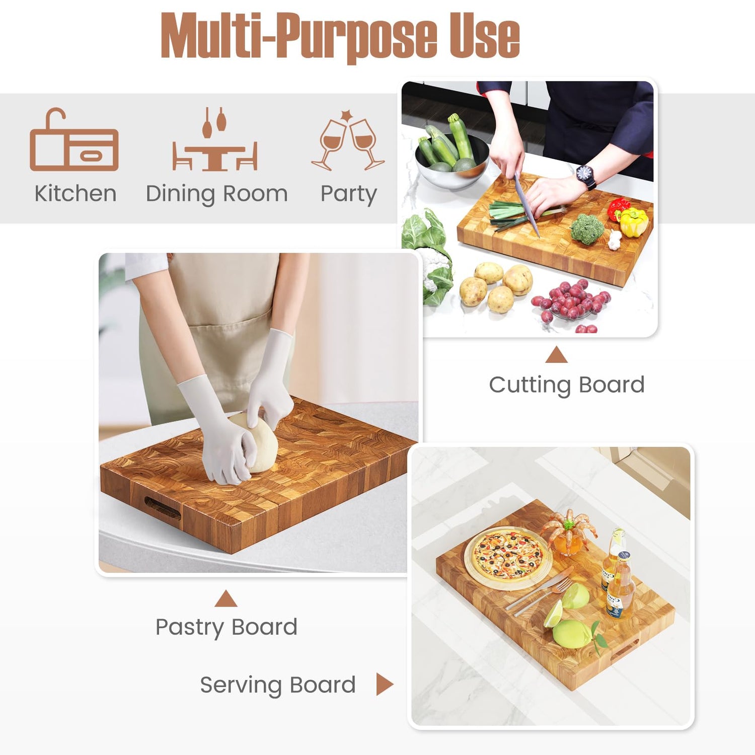Giantex Teak Wood Cutting Board, 2" Thick End Grain Chopping Block with Hand Grip, 18"x12" Large Reversible Butcher Block, Pre-Conditioned With Natural Waxes & Oils, Carving Board for for Meat Cheese