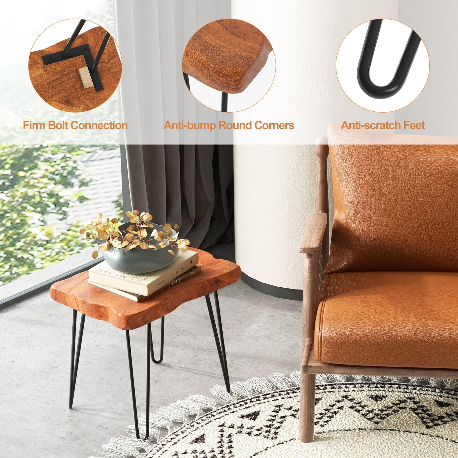 - Sturdy Metal Legs: In addition to the high-quality tabletop, the live edge side table boast 3 heavy-duty metal legs to form a sturdy and stable structure. Each leg is fitted with anti-scratch round foot, thus to protect your hardwood floor.