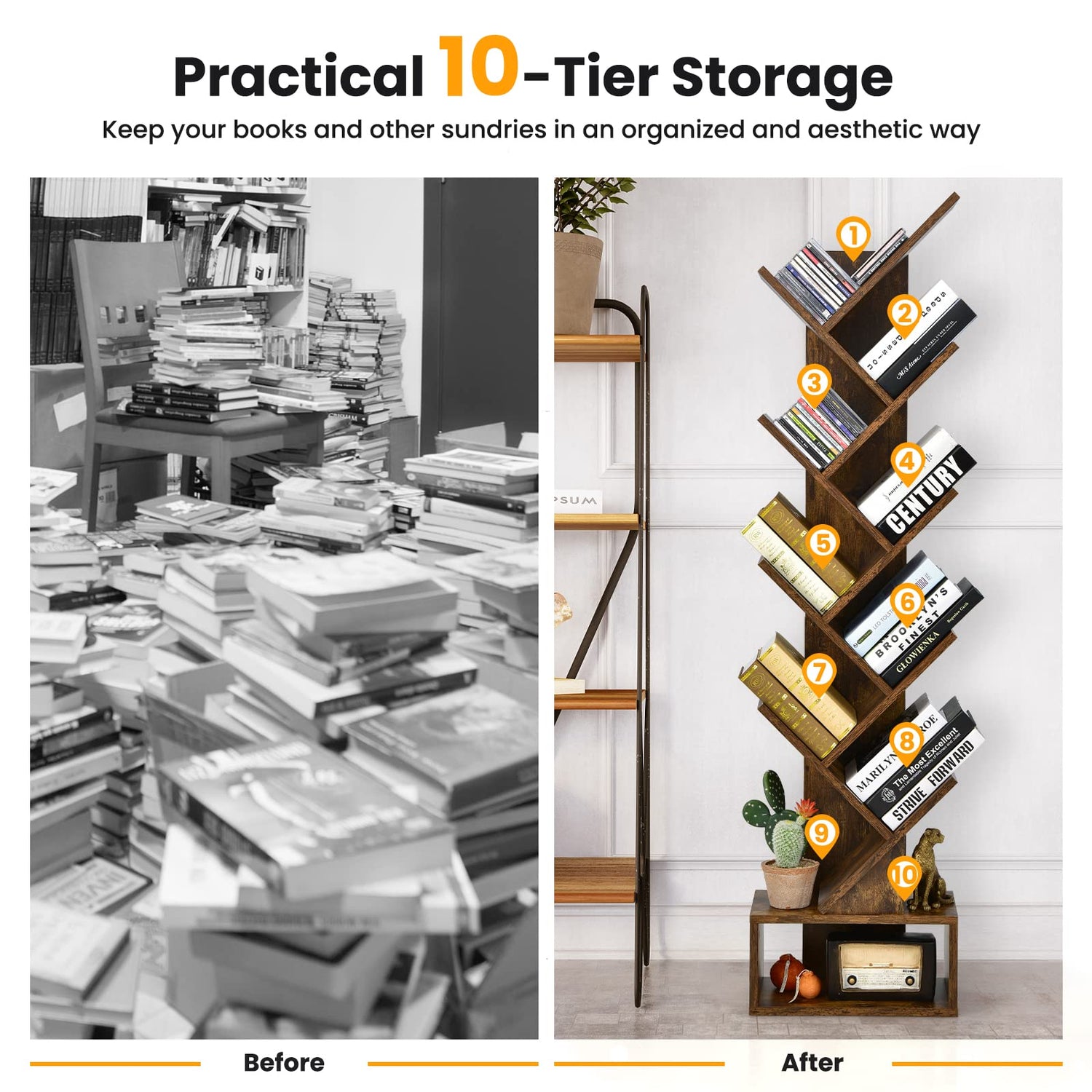 - [Unique & Aesthetic Way of Display]: The 10 shelves of the tree bookcase in staggered pattern not only form sturdy structure, but make exquisite display of the books and other ornaments. Thus, the bookcase a unique and attractive addition that blends into the other furniture in your living room, study room or office.