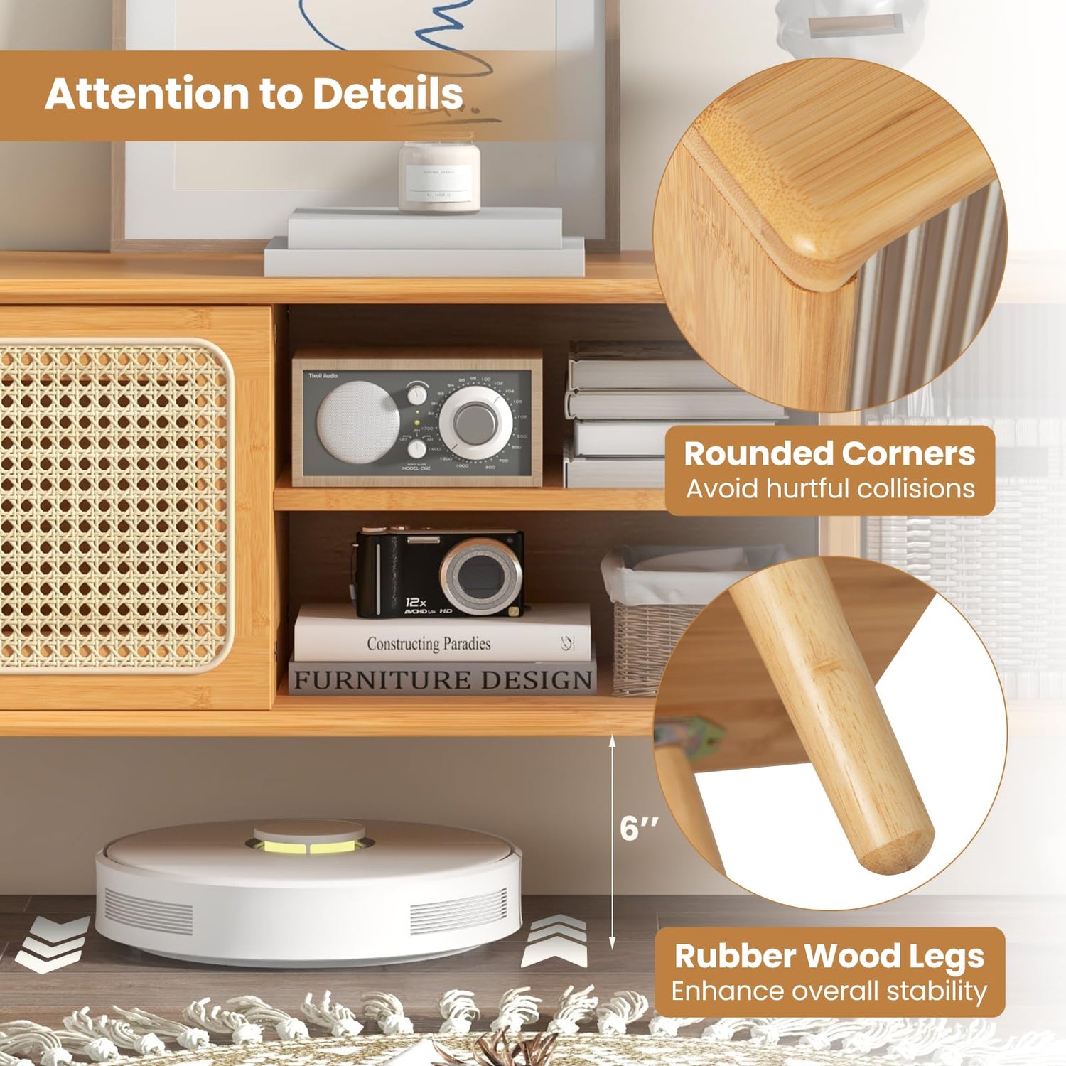 Giantex TV Stand for Living Room TVs up to 55”- Bamboo Entertainment Center with 3-Level Adjustable Shelf, Cable Management Holes, PE Rattan & Tempered Glass Sliding Door, TV Cabinet for Bedroom