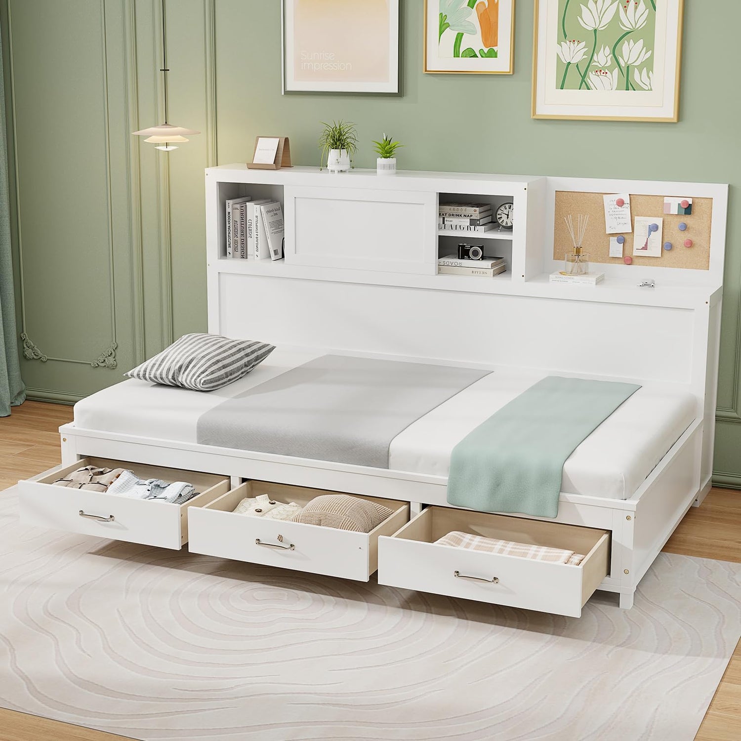Giantex White Twin Daybed with 3 Storage Drawers, Cork Board & Sliding Door