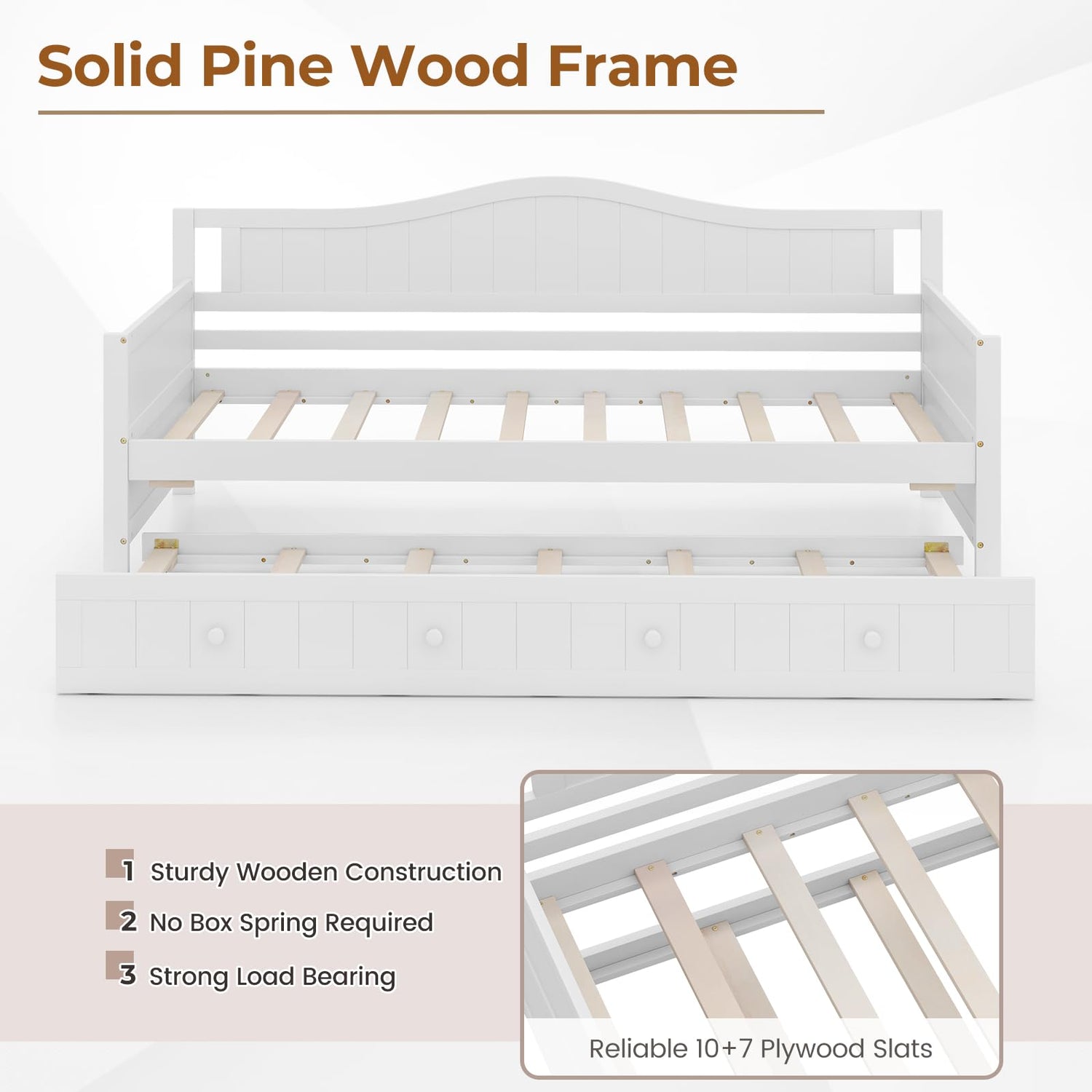 Giantex Twin Daybed with Trundle, Solid Wood Day Bed with Slats Support, Integrated Headboard & Armrests, Modern Trundle Bed Twin for Living Room, Bedroom, Guest Room, No Box Spring Needed (White)