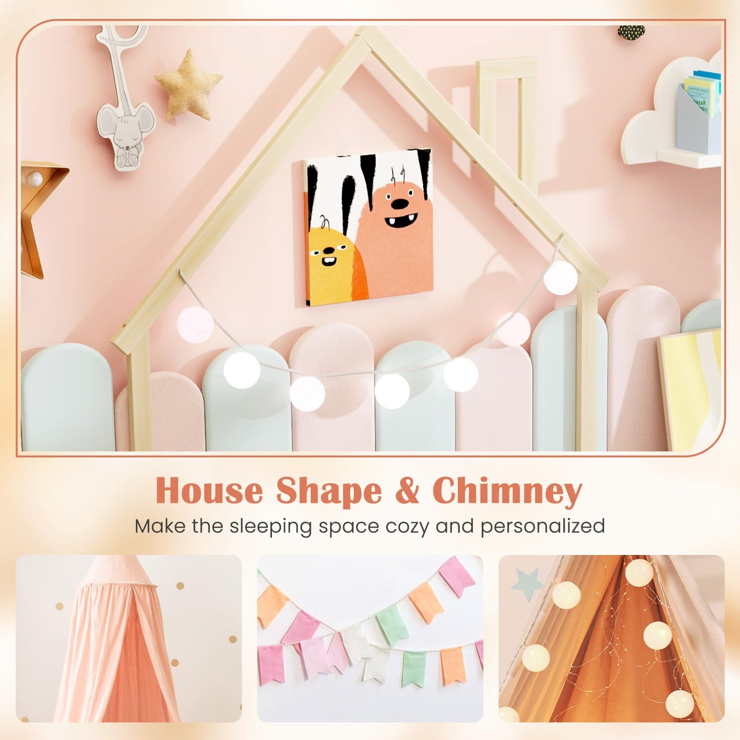 House shape and chimney make the sleeping space cozy and personalized