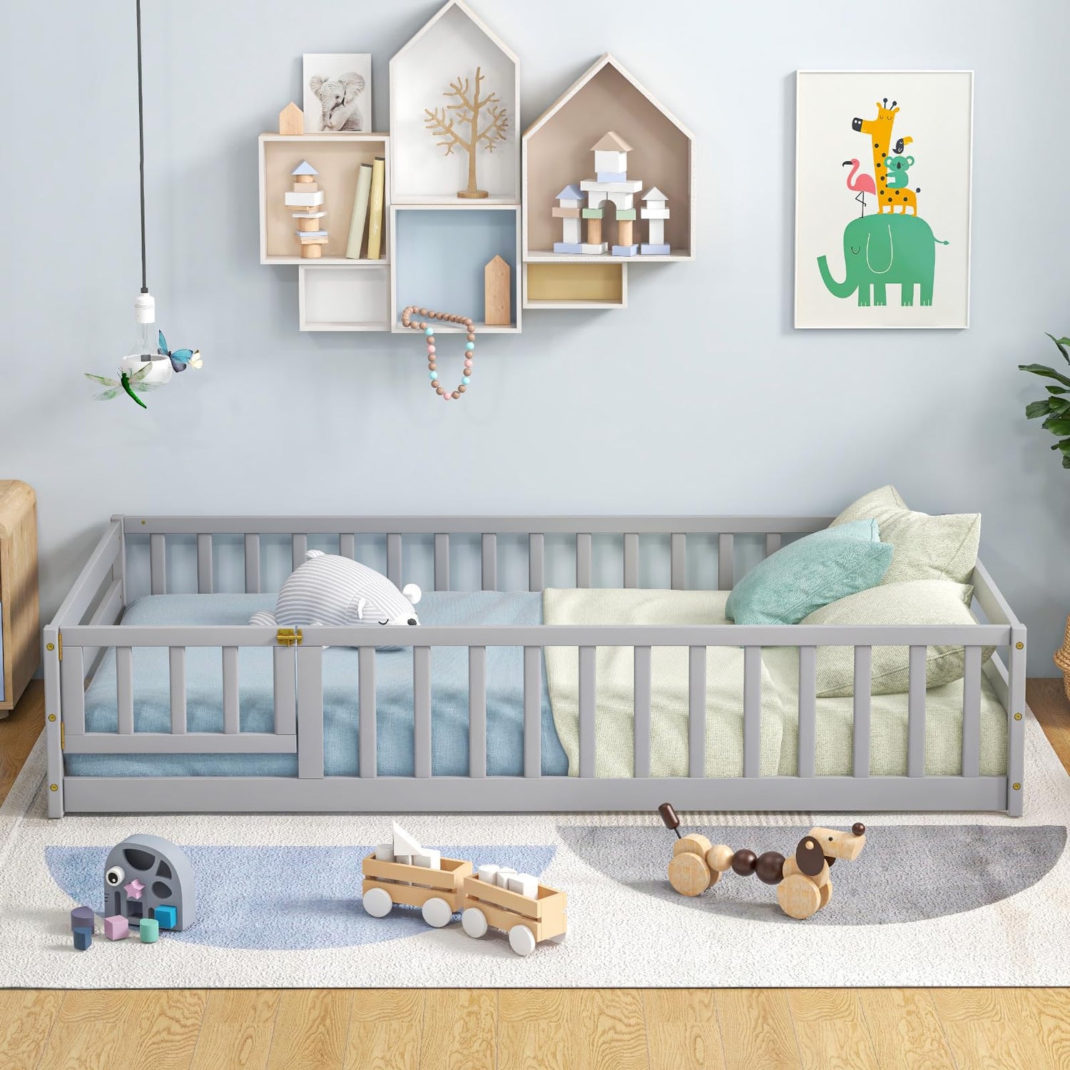 Giantex Twin Floor Bed with Door & Fence, Kids Wood Montessori Bed with Safety Guardrails, Floor Bed Frame for Kids, Boys, Girls, No Box Spring Needed, Floor Bed Twin (Grey)