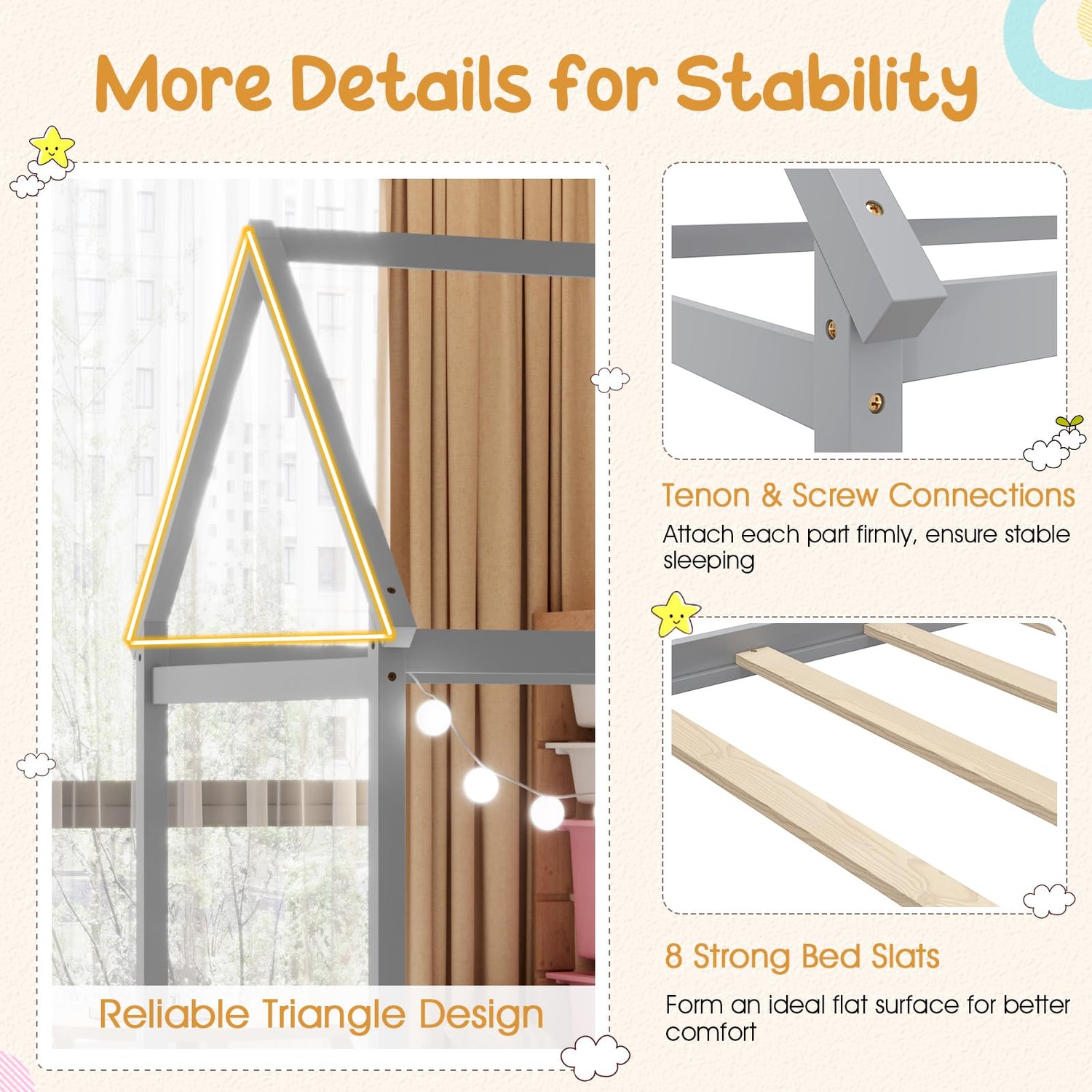 Crafted from high-quality solid wood and sturdy plywood, this twin bed frame is built for durability, providing a safe and secure sleeping environment. The smoothly-polished surface ensures a burr-free touch, making it perfect for kids.