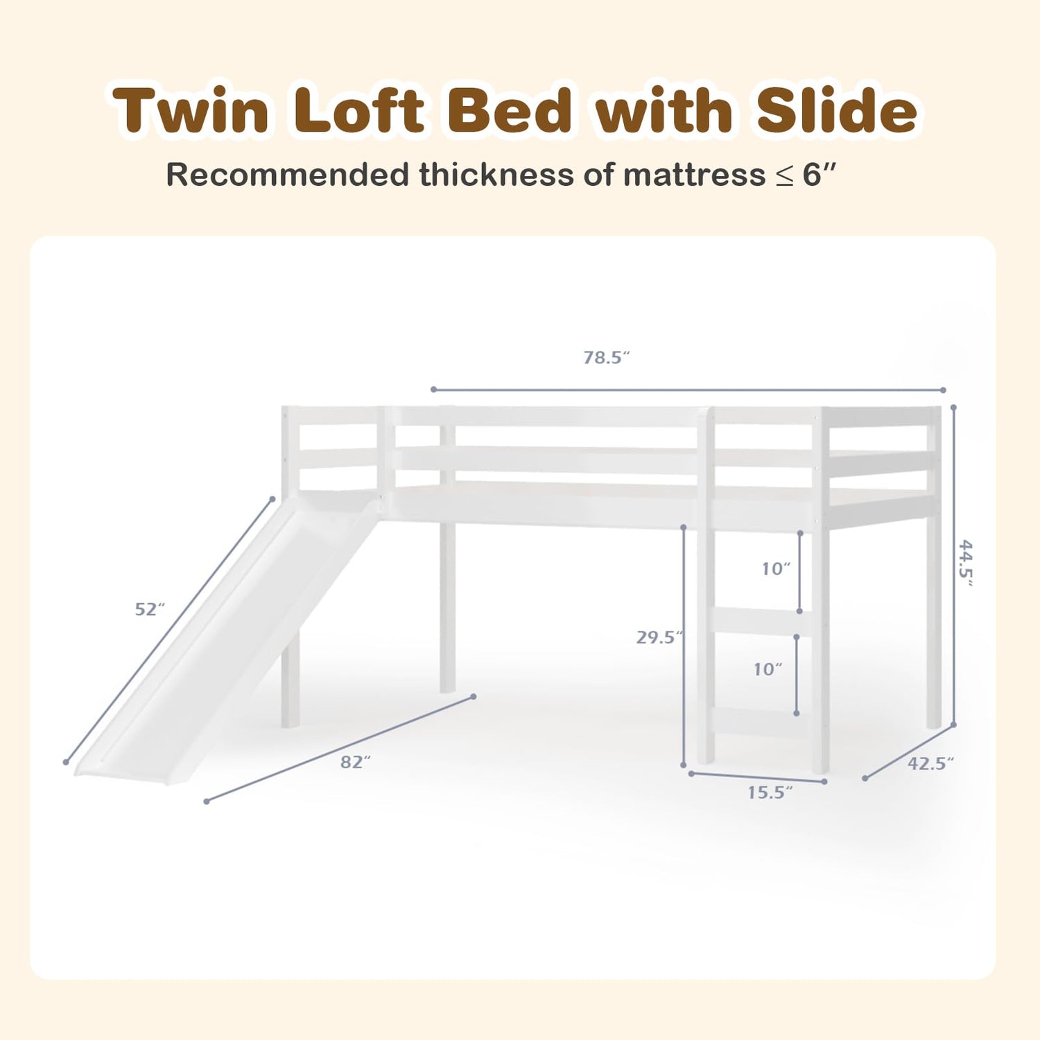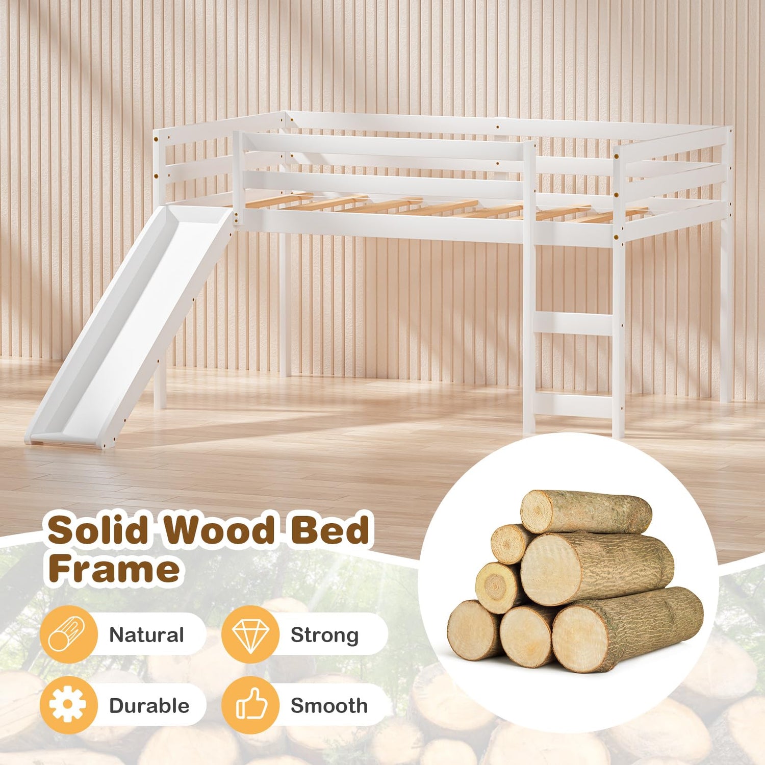 Giantex Twin Loft Bed with Slide, Wood Low Loft Bed for Kids, Toddlers, Climbing Ladder & Storage Space, Twin Kids Bed for Girls Boys, No Box Spring Needed, White