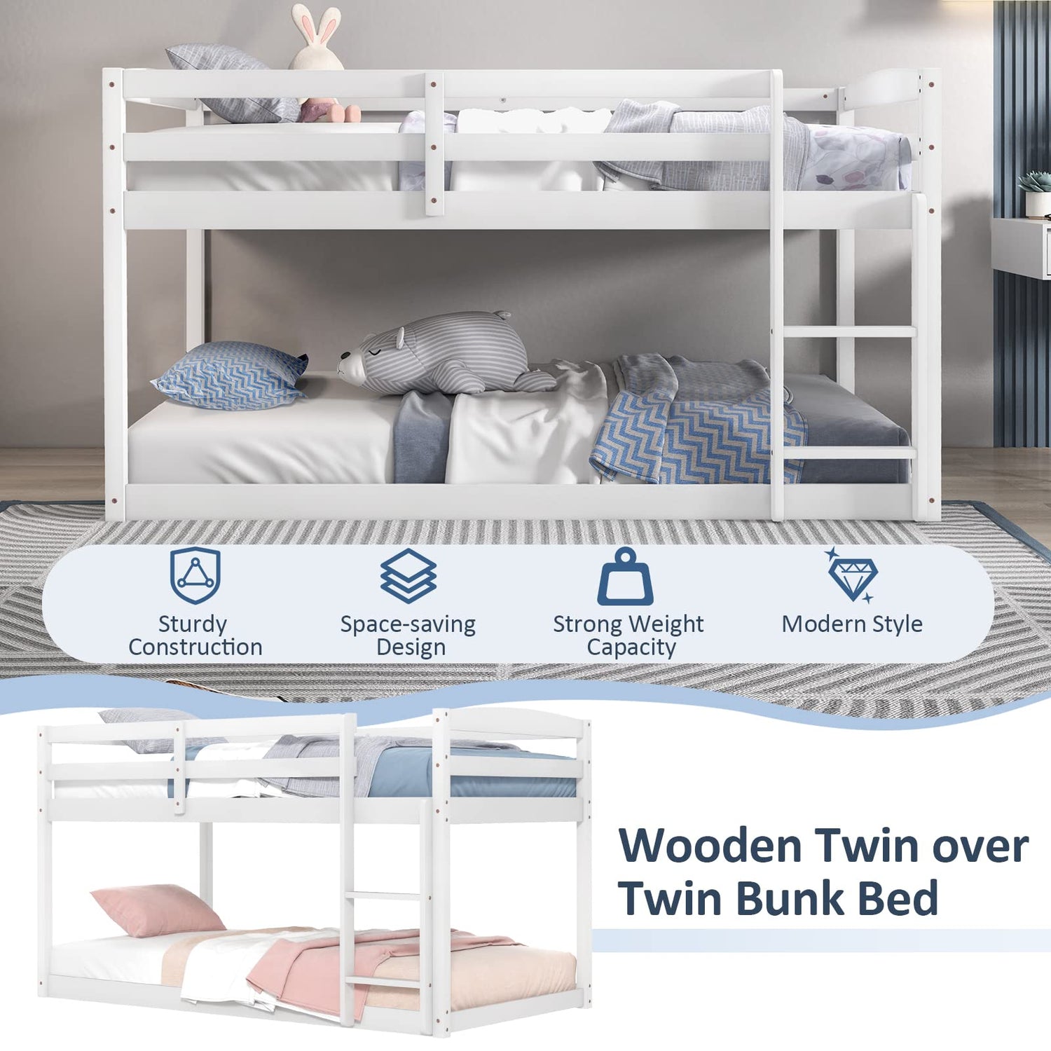 Giantex Twin Low Bunk Bed Frame - Solid Wood Twin Over Twin with Full Guardrails & Integrated Ladder, Space-Saving Design, White