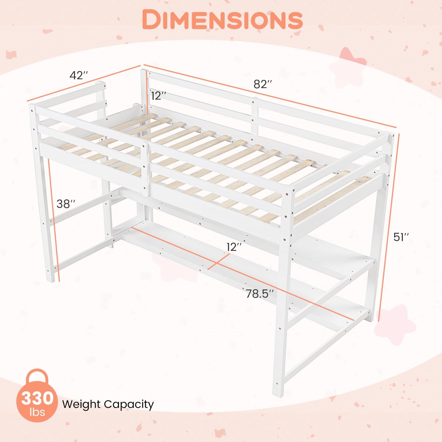 Giantex Twin Low Loft Bed with Storage Shelves, Wooden Loft Bed with Full-Length Guardrails & Ladder, Modern Space-Saving Twin Bed Frame for Kids Dorm Apartment, No Box Spring Needed, White