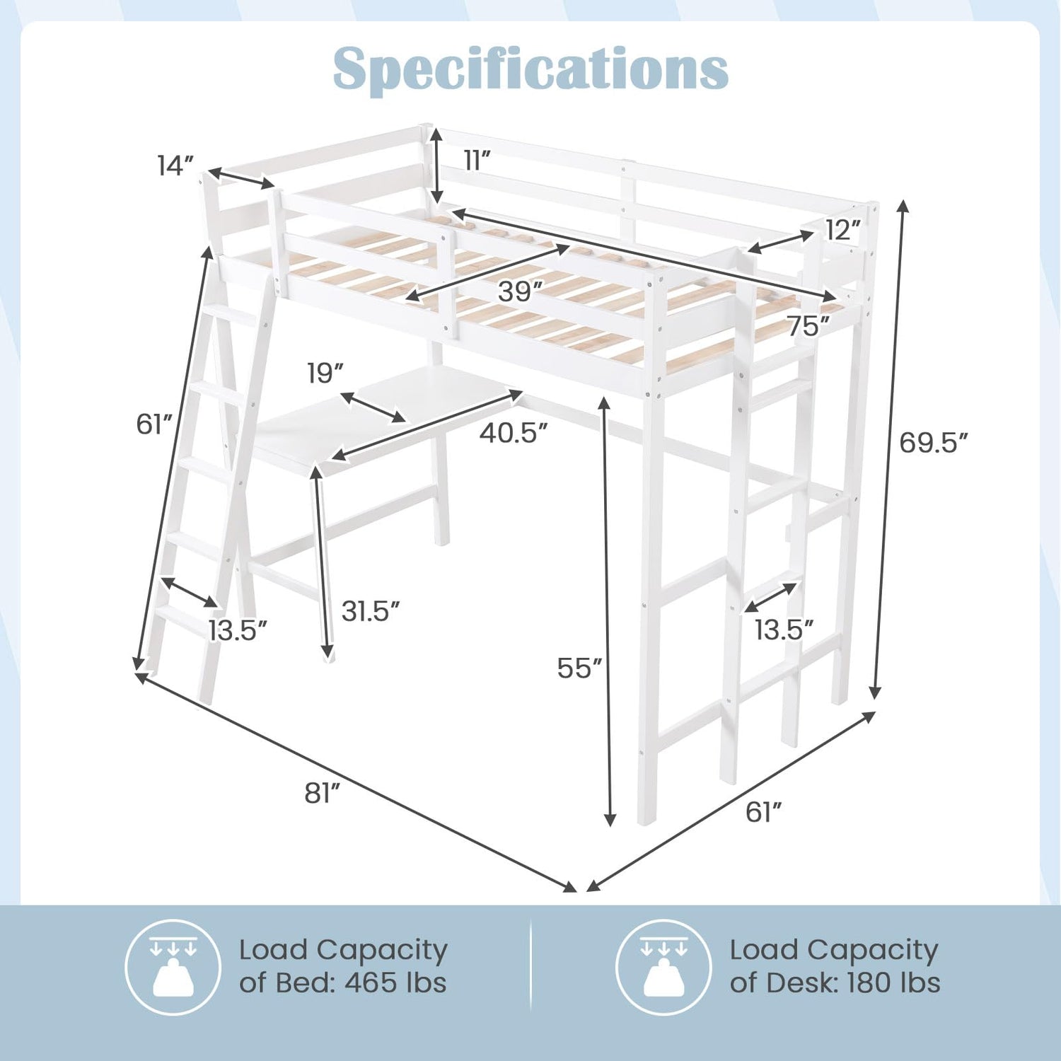 - [Space-saving Loft Bed with Desk]: Combined with a 40.5" x 19" desktop, the twin loft bed makes full use of the vertical space, allowing you to read, work, do homework or play underneath.