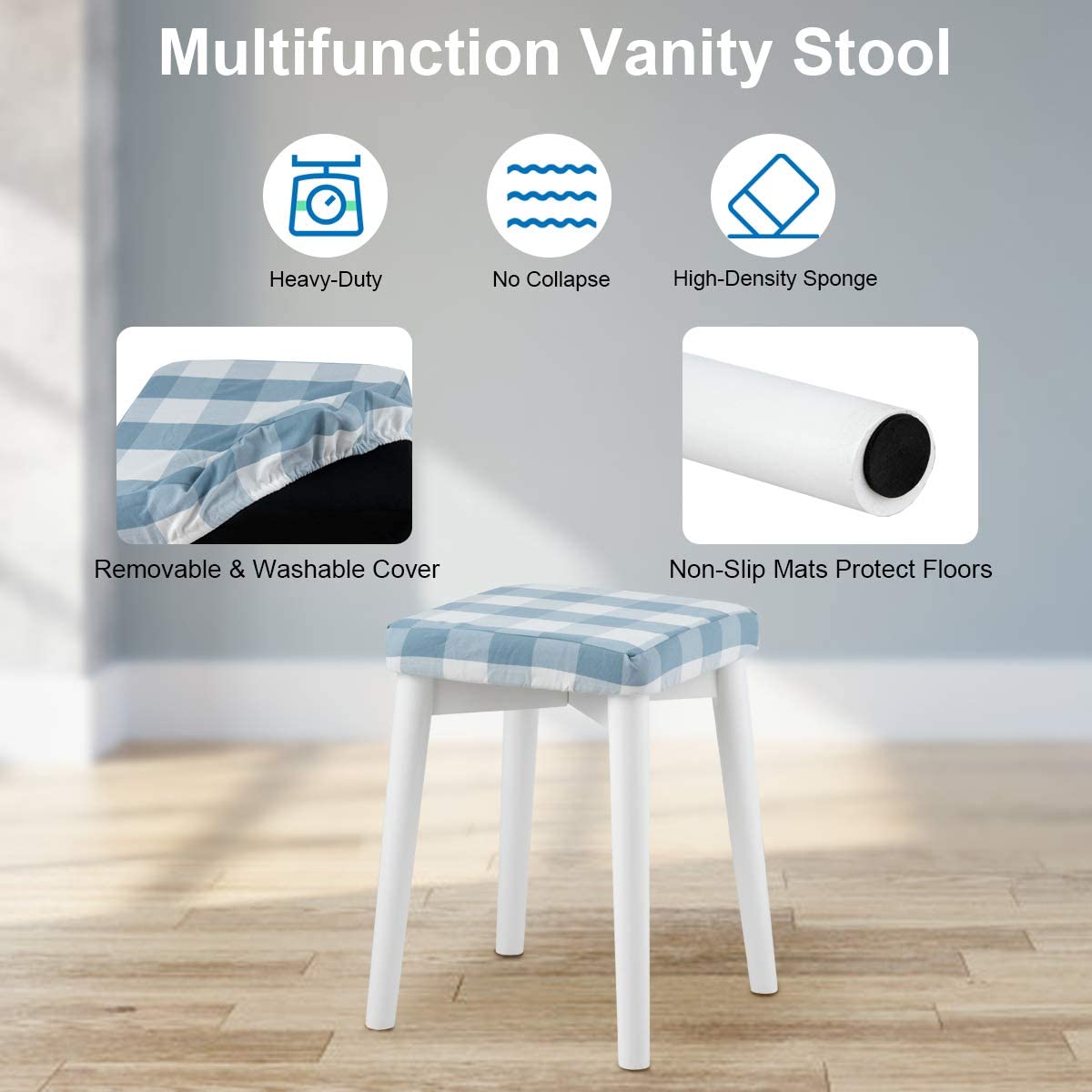 - 〖Soft Cushioned Stool with Removable Cover〗 The cushion of this dressing stool is made of soft cloth and sponge. High density and thick sponges is comfortable to sit with high resilience. The detachable grid cushion cover is breathable and easy to clean. It’s perfect for perching on when you're doing your hair or makeup. However, this separate matching stool can also be used as an ordinary stool.