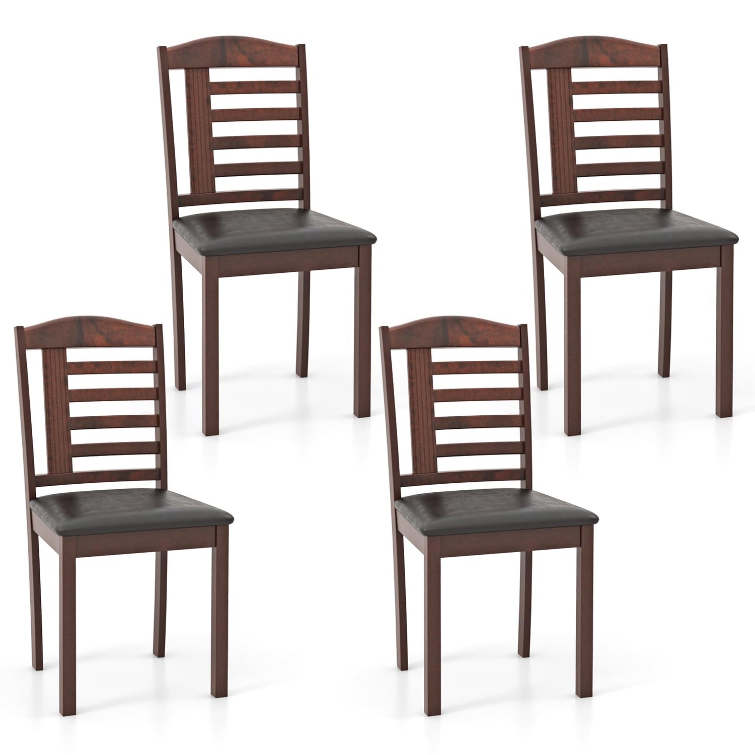 Our dining chair set includes 4 wooden chairs, with the option to purchase additional chairs to mix and match with dining tables of varying sizes. Featuring an oak wood finish and beautiful brown detailing, these chairs exude luxury and sophistication, complementing a range of decor styles. Supported by solid rubber wood legs known for their strength and resistance to deformation, these kitchen chairs can support up to 265 lbs. The padded seat cushion and curved backrest offer optimal comfort and support, conforming to your body's natural curves and promoting proper posture. Covered in PU leather, the seat provides a comfortable touch while adding a touch of elegance to your dining space. Whether it's a formal dinner or a casual gathering, these chairs will keep you seated comfortably for hours on end.