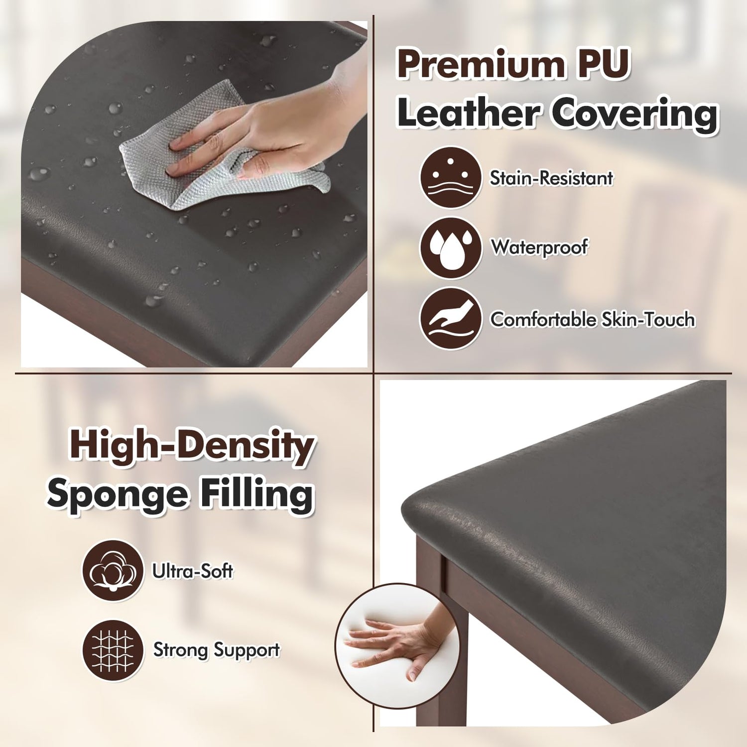- [Premium PU Leather Covering]: The high-quality PU leather covering the seat not only offers a comfortable feel but is also stain-resistant and waterproof for easy cleaning. It also adds a touch of luxury to your chairs while providing practicality.