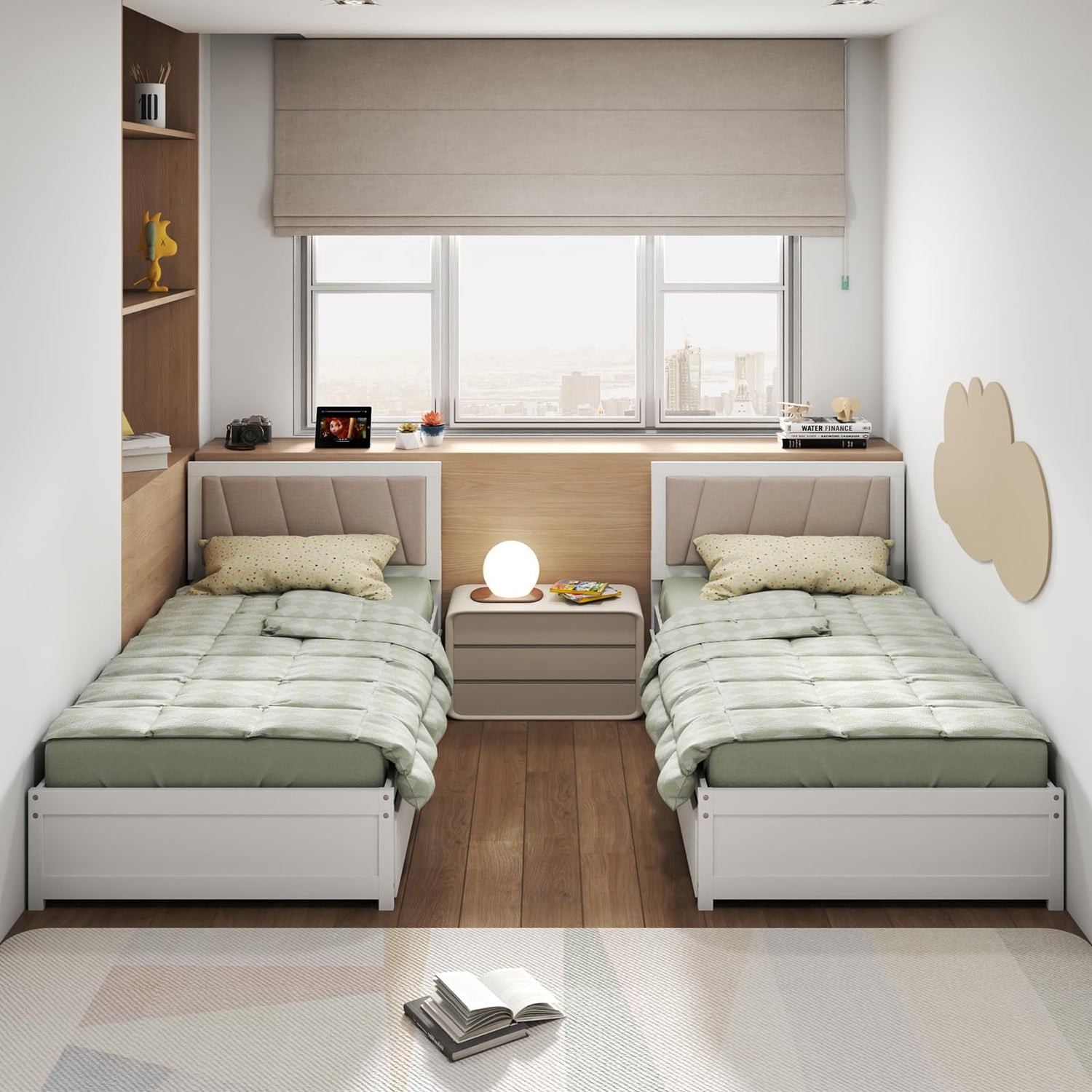 The twin bed frame comes with 2 rolling drawers for large storage space. Besides, the twin bed frame boasts a supportive sponge-padded headboard that is upholstered in enduring faux linen fabric. Its stable solid wood frame with 8 sturdy plywood slats supports up to 350 lbs. The embedded platform design eliminates the need for a box spring and prevents mattress slippage, ideal for an 8" thick mattress for optimal comfort. Featuring a stylish tufted headboard, this bed suits adults, kids, and teens alike.