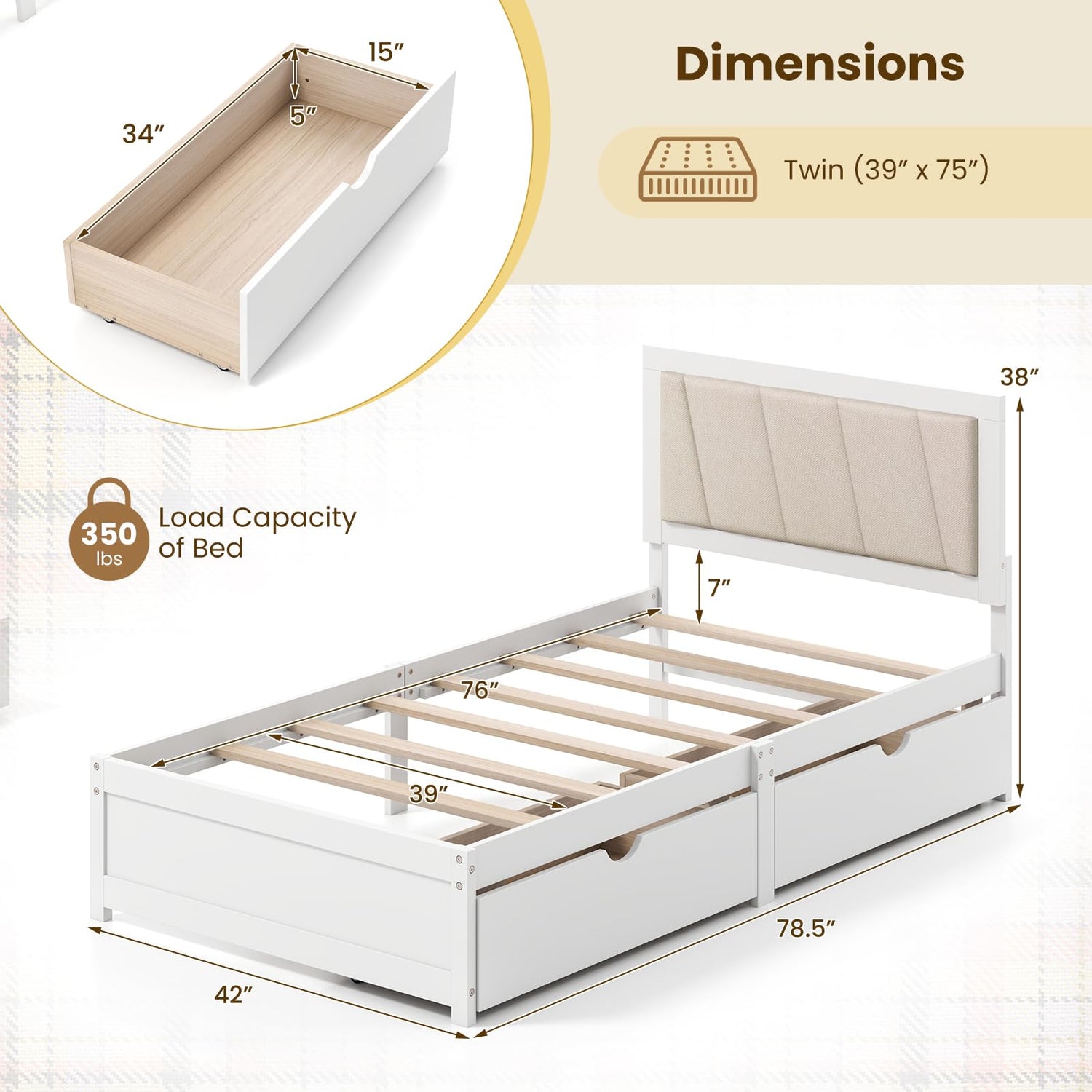 Giantex Wood Twin Bed with 2 Storage Drawers, Solid Wood Platform Bed with Upholstered Headboard, Wooden Slats Support, Twin Bed Frames for Kids Teens Adults, No Box Spring Needed, White & Beige