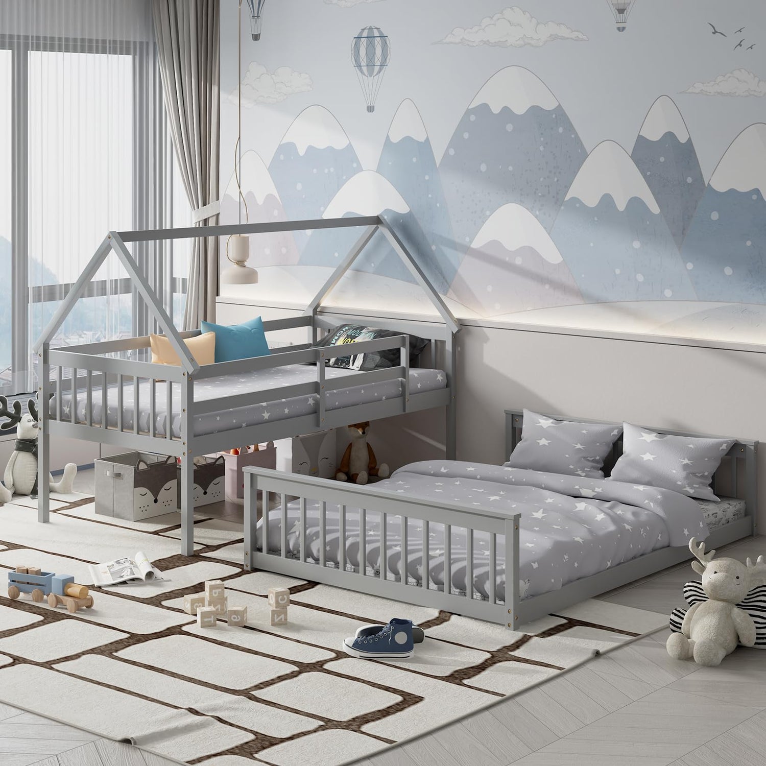 Giantex Wood Twin Over Full Bunk Bed, Solid Wood House Bed Frame Built in Ladder & Safety Guardrails, Convertible to 2 Beds, Floor Bunk Bed for Kids Teens Juniors, No Box Spring Needed, Grey