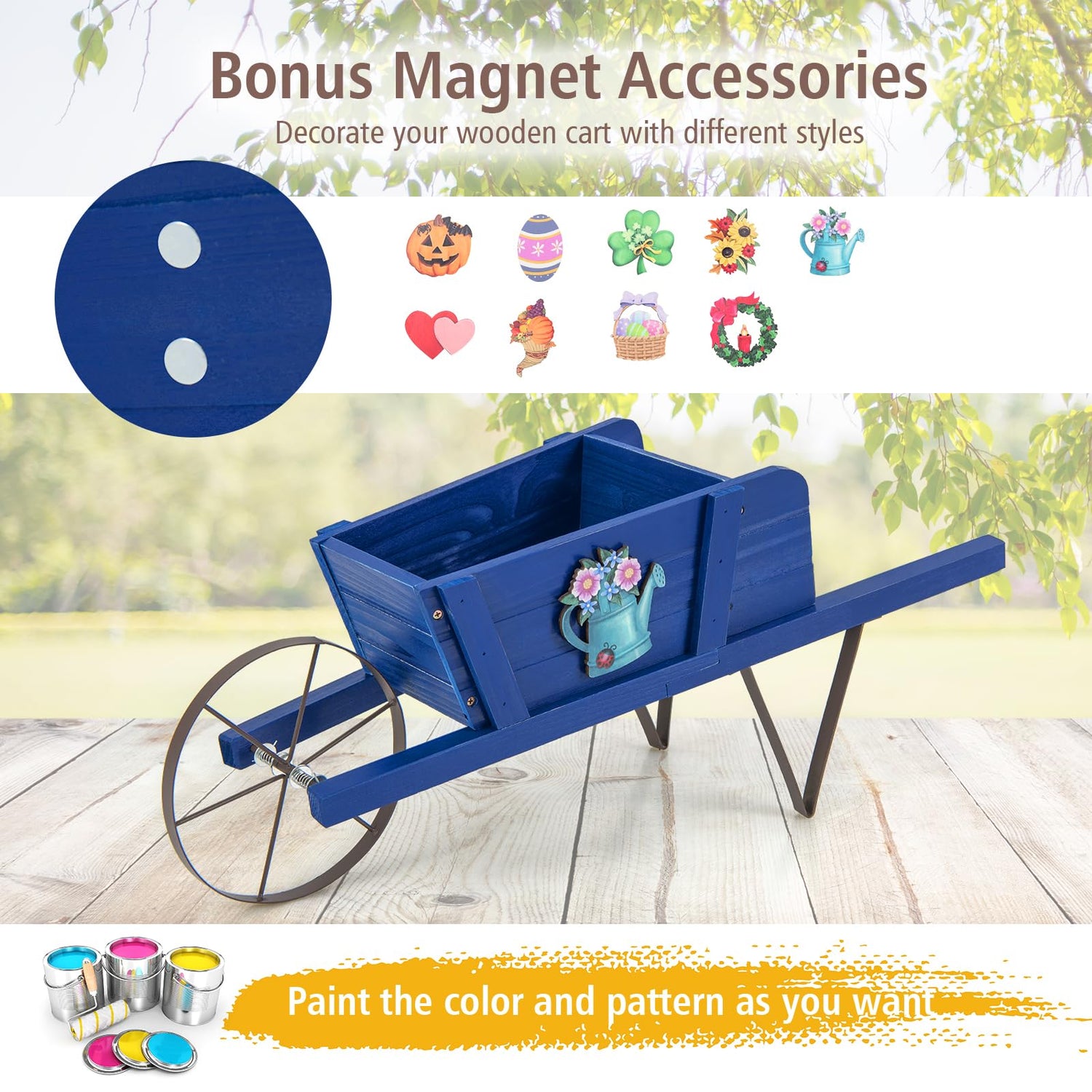 Giantex Wooden Wagon Planter, Small Wheelbarrow Wagon Flower, Indoor & Outdoor Raised Bed W/ 9 Magnetic Accessories, Wheel, 2 Handle, Wood Flower Cart Planter for Garden Backyard Holiday (Blue)