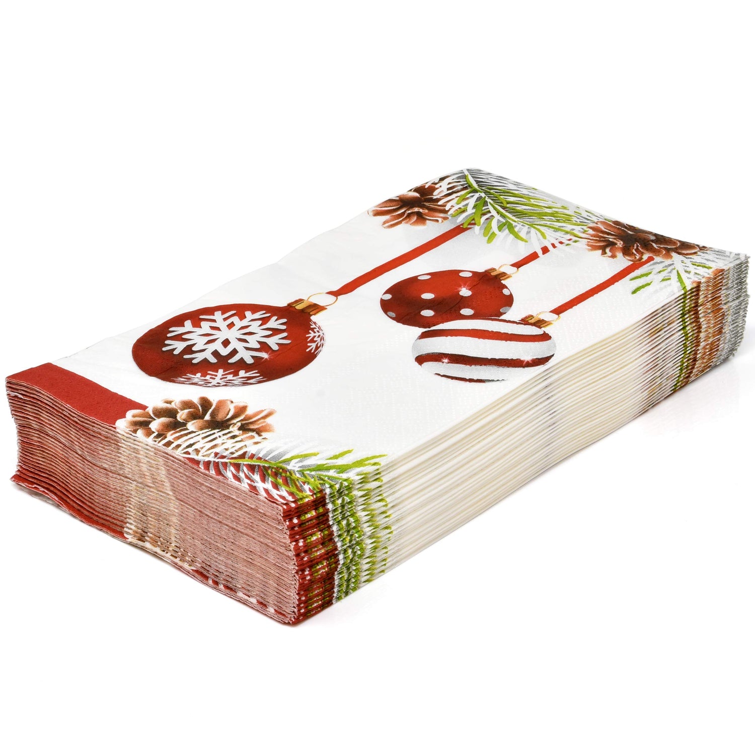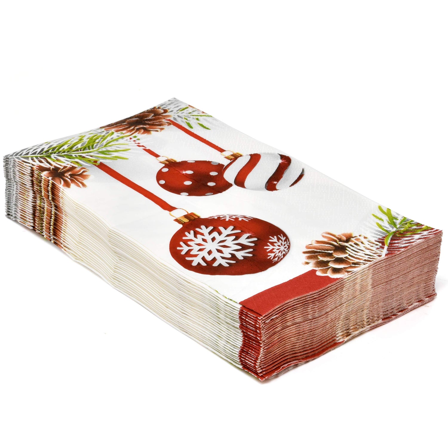 Details: Christmas Guest Napkins: Gift Boutique Christmas guest napkins includes 100 dinner napkins featuring elegant hanging ornaments with pine leaves and cones! High Quality: Napkins are made of high quality thick paper and are soft and absorbent; great for a Christmas themed party; the vibrant colors of the napkins really add dimension to your parties as your guests will love the pretty design. Enough For Your Guests: Stock up with this set of Christmas guest napkins to make sure you have enough for any Christmas party or event. More Time To Enjoy: Disposable paper reduces clean up time so you can enjoy more time with friends and family during the holiday season; ideal for adults, teens, boys and girls. Dimensions: Napkins are 3 ply and measure 7.5" x 4.25" folded and 15" x 12.75" unfolded; perfect for dinner table placement, office, party decor, powder room, bathroom vanity, and kitchen counter top, guest bathrooms and holiday celebrations.