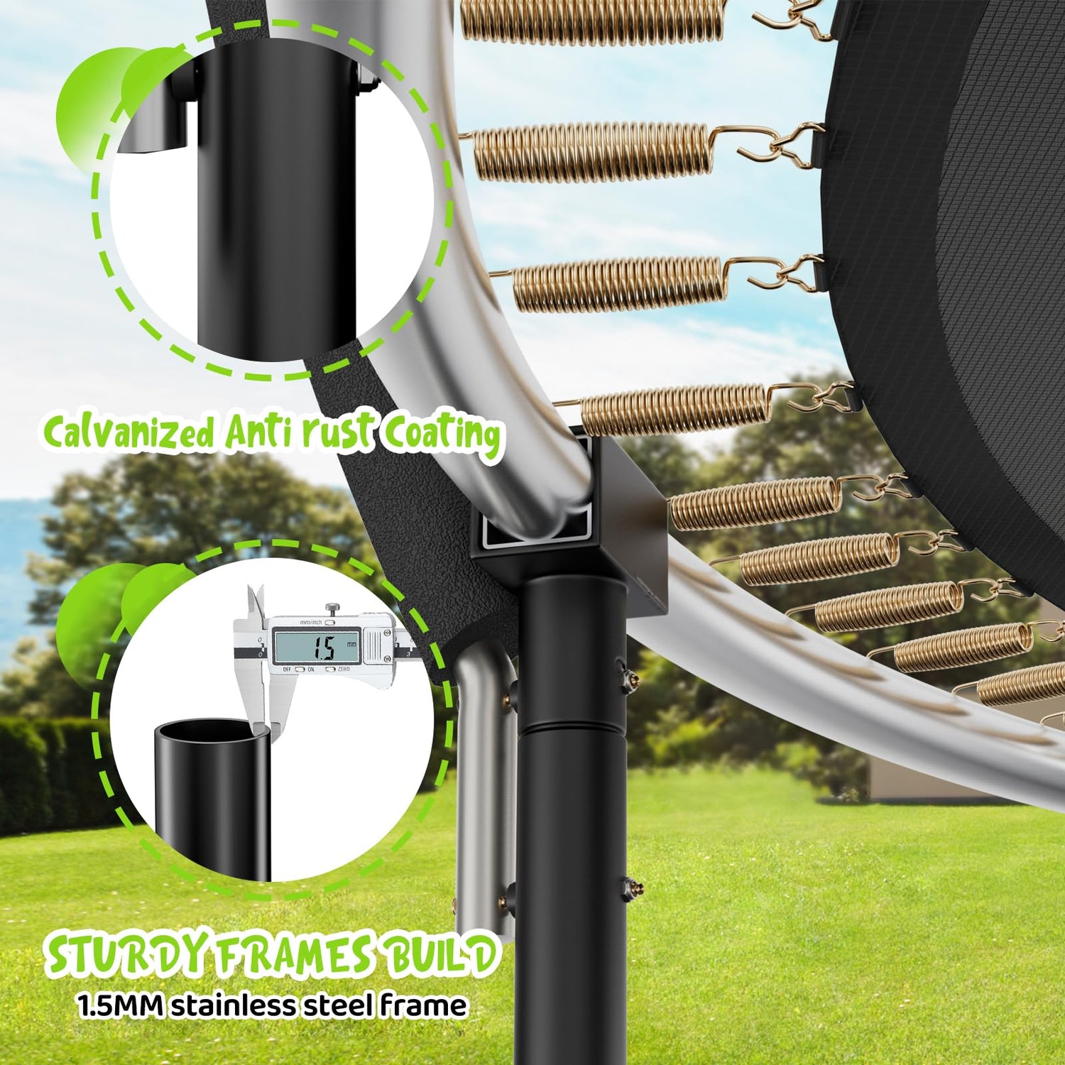 • 【More Durable Trampoline】Our trampoline outdoor boasts a durable frame made from weather resistant, rust proof galvanized steel. In addition, the W legs are coated with a premium black protective layer that not only elevates the overall look but also enhances rust resistance and weather durability.