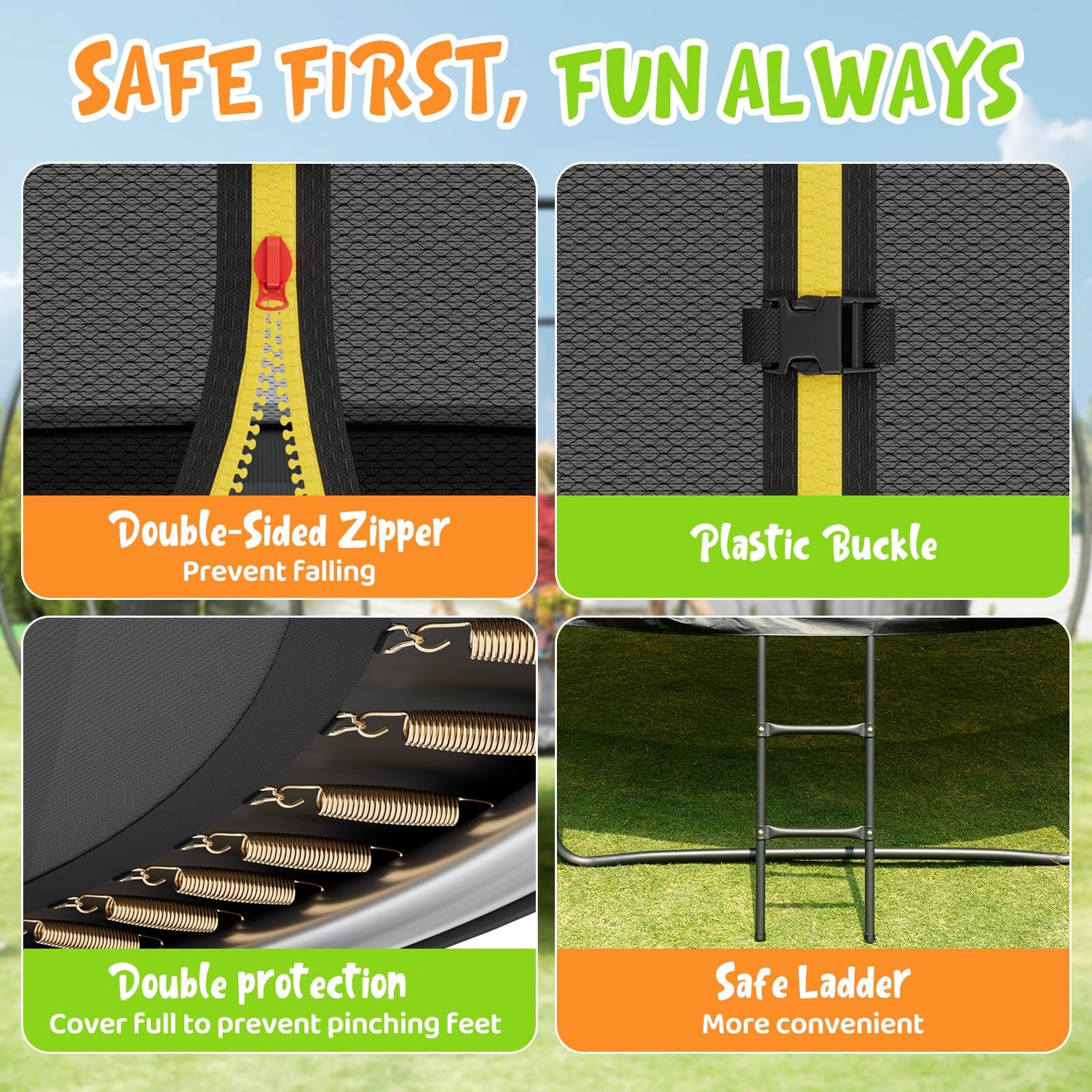 • 【High-Performance Jumping Mat】Our 14ft trampoline is equipped with a premium jumping mat that’s UV-resistant, waterproof, and fade-resistant for long-lasting performance. Reinforced with heavy-duty stitching, the mat offers superior durability and elasticity, providing a strong, stable bounce with every jump.
