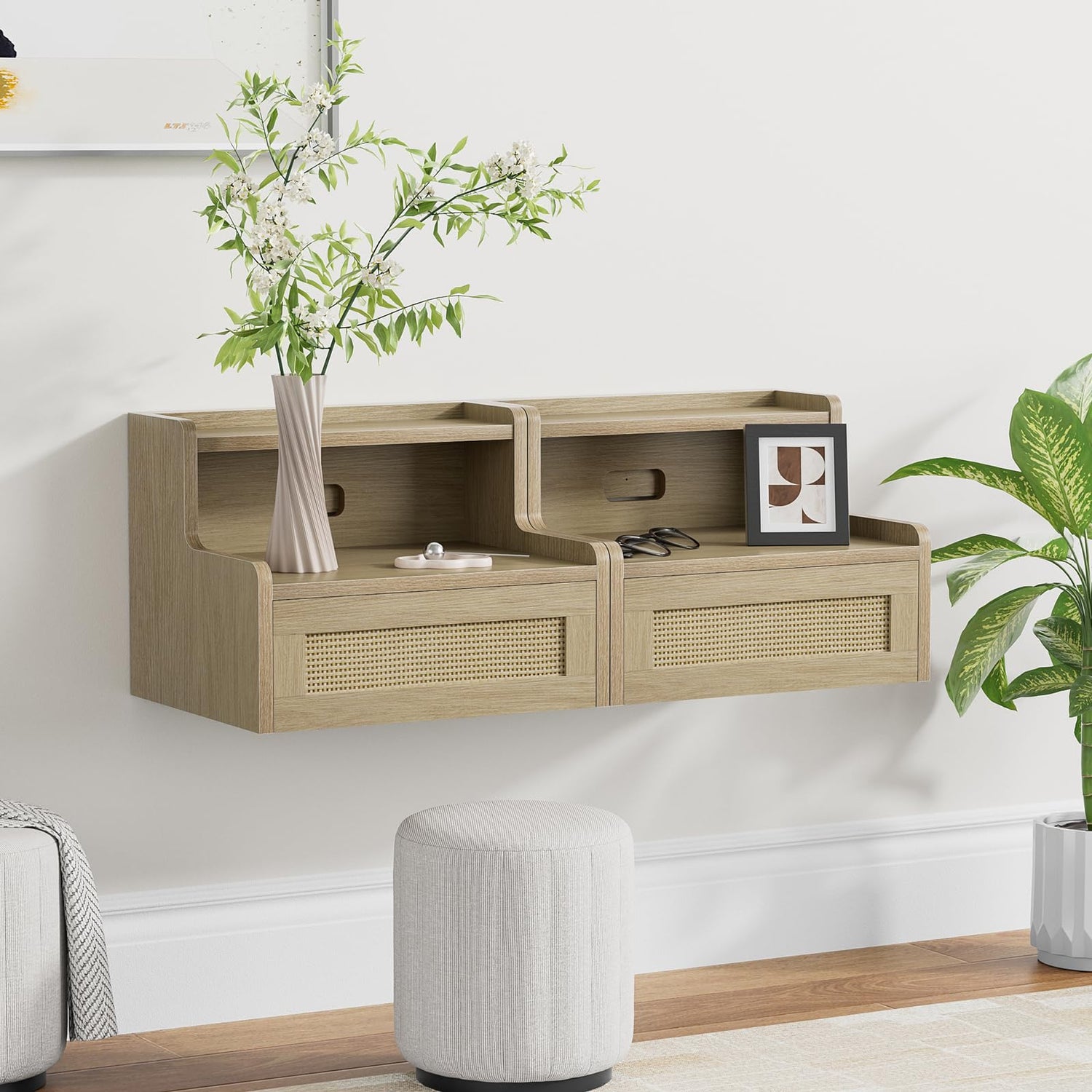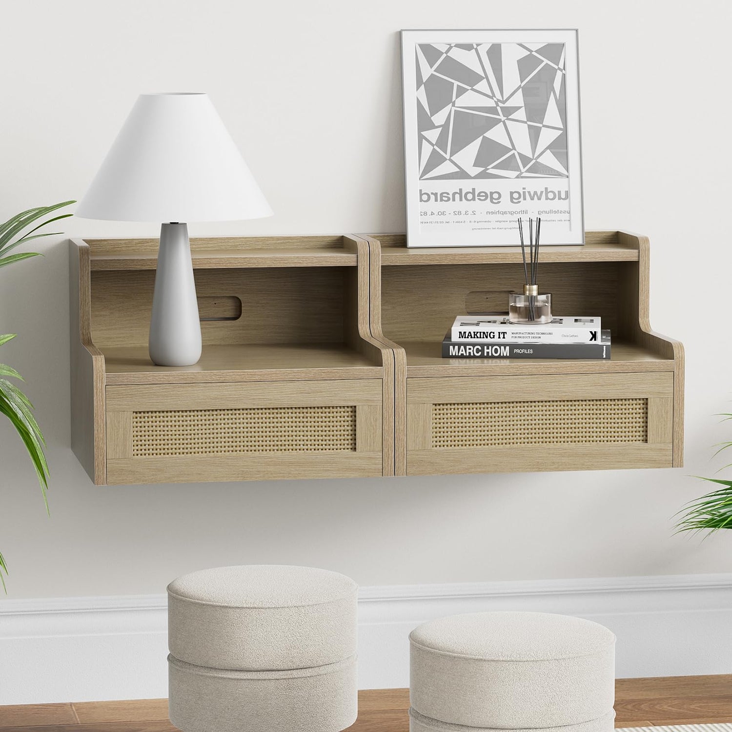Giluta Floating Nightstand Set of 2 with Drawer & Open Shelf, Small Bedside Table Floating Night Stand for Bedroom Wood Wall Mounted Nightstands