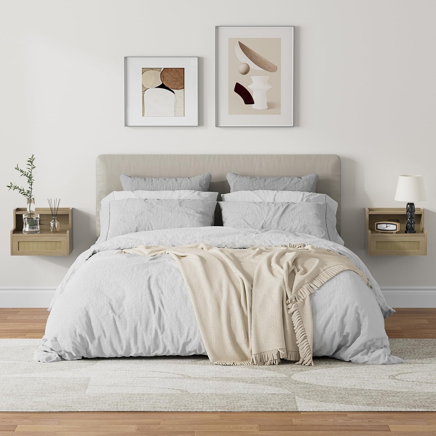 - Modern Convenient Design: Aobafuir floating nightstand is a space saving modern piece with both closed and open storage. Get ready to take your bedroom's convenience level up a notch with this wall mount nightstand. The light and simple lines of the white nightstand with its neutral and natural tones makes it a perfect element to blend well with any furniture.