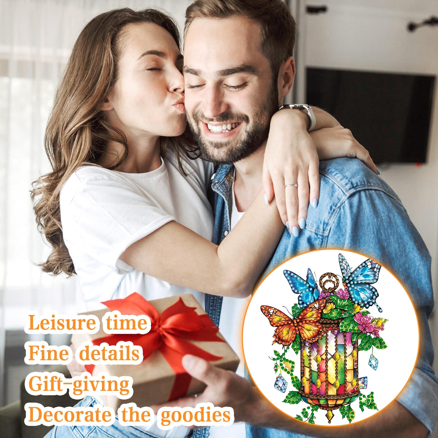 - In a magical garden, two butterflies with vibrant wings of blue and orange flutter around a colorful lantern adorned with lush flowers and ivy. The lantern, hanging from a chain, is a beacon of hope and beauty, symbolizing the transformation and resilience of nature. This enchanting scene has been transformed into a stunning diamond painting, capturing the essence of the garden's charm and the butterflies' grace.