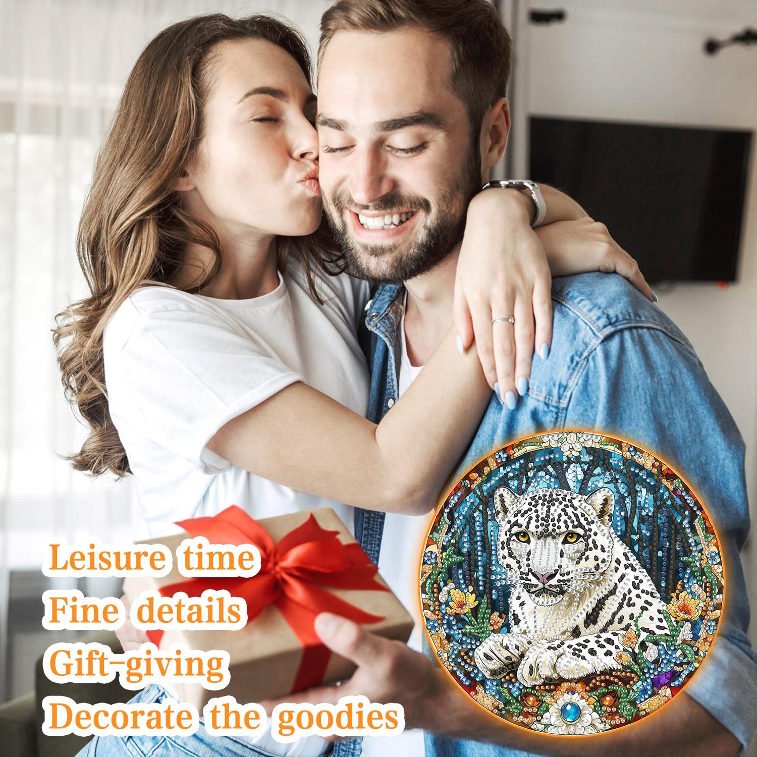 - In a mystical forest, a majestic white leopard lies gracefully among vibrant flowers and lush foliage. Its piercing eyes seem to tell countless stories of the wild. The intricate details of the stained glass background add a touch of fantasy and elegance, making this diamond painting a true masterpiece that captures the spirit of nature's beauty and wilderness