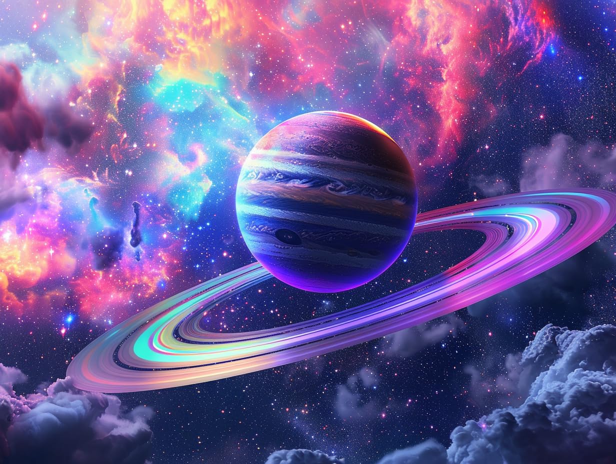 - In a distant galaxy, a majestic planet floats serenely, its vibrant rings shimmering with hues of blue and purple. The cosmic sky is ablaze with colors, a symphony of light and darkness intermingling. This celestial scene invites us to dream big and explore the endless possibilities of the universe. Each diamond in this painting represents a piece of the cosmos, capturing the essence of the infinite expanse and the beauty of the unknown.
