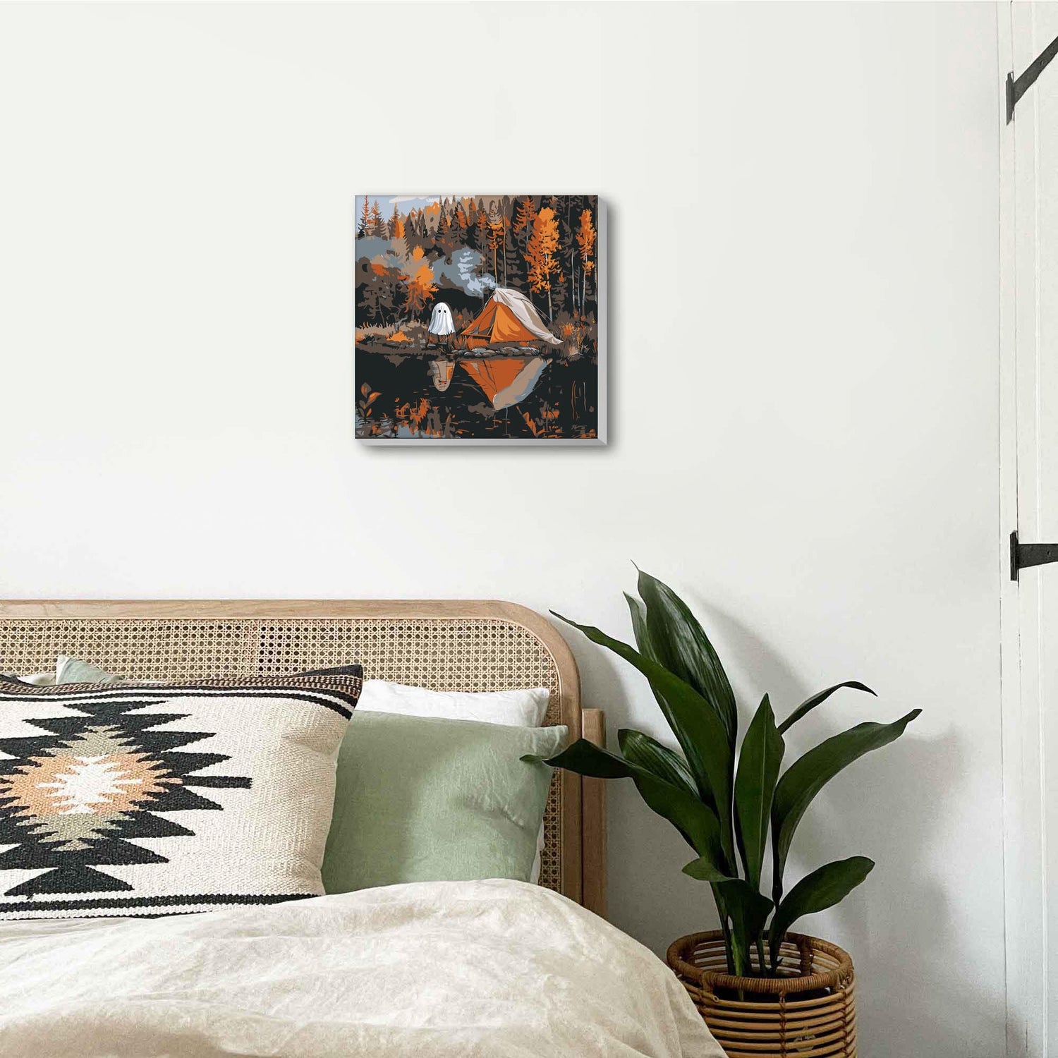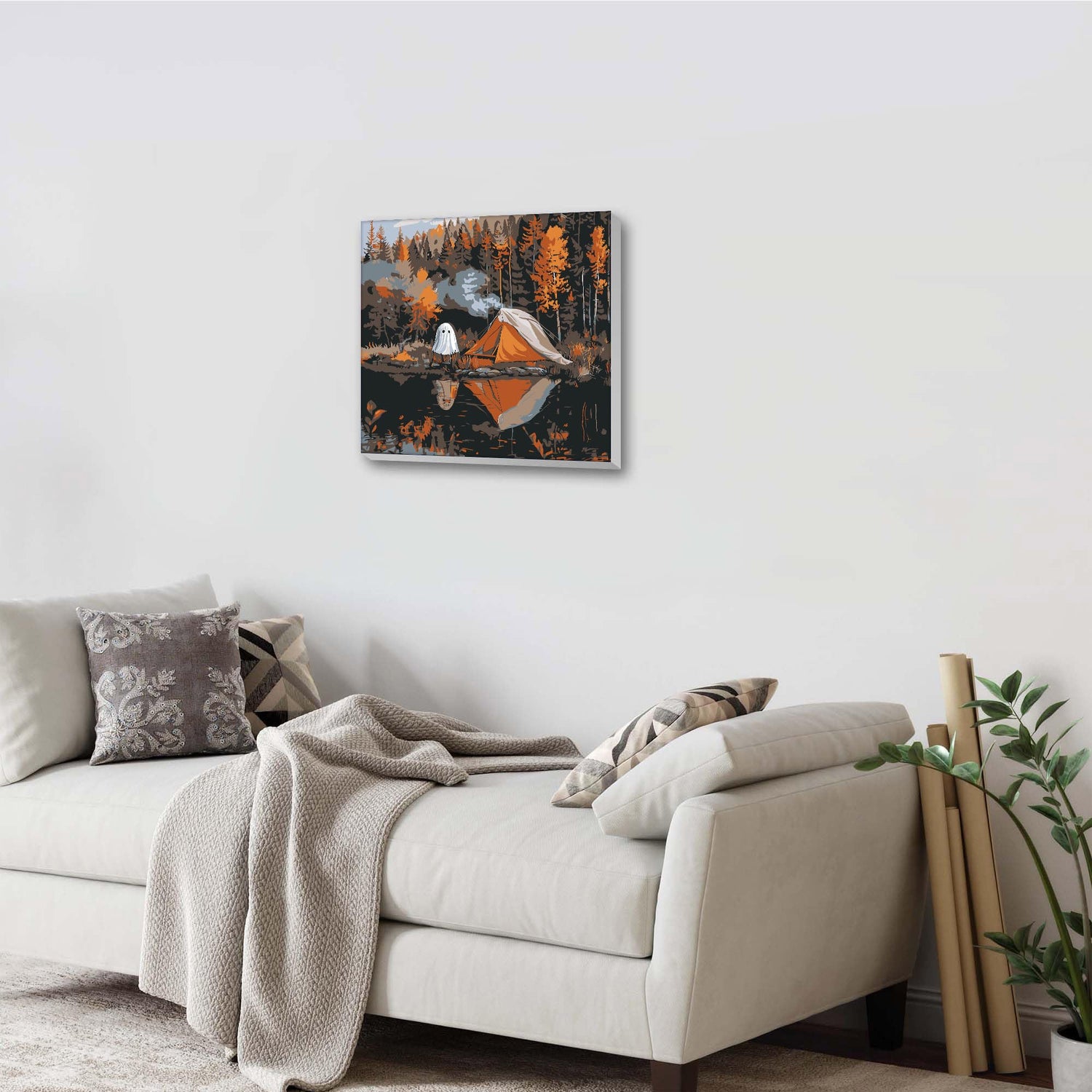 - In the heart of an autumn forest, a cozy orange tent rests by a calm lake. A gentle ghost sits near a crackling campfire, sharing stories under the starry sky. The trees, ablaze with fall colors, mirror in the water, creating a serene and magical scene. This tranquil moment invites reflection and wonder, that captures the essence of nature's beauty and the warmth of companionship