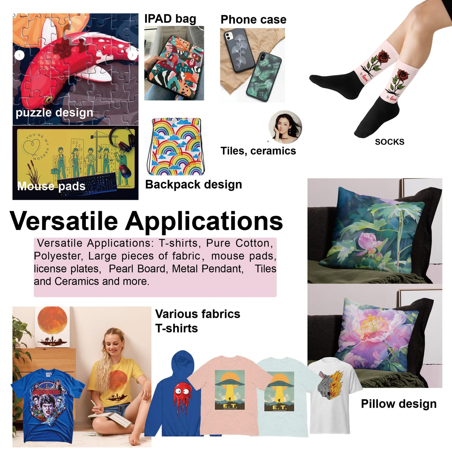- 🎀Versatile Applications: This versatile machine is designed for a range of applications. From T-shirt printing to heat transfer vinyl (HTV) and industrial-quality sublimation printing, . It works seamlessly with a variety of materials such as cotton, polyester, chemical fibers, mousepads, ceramic tiles, metal pendants, and more.
