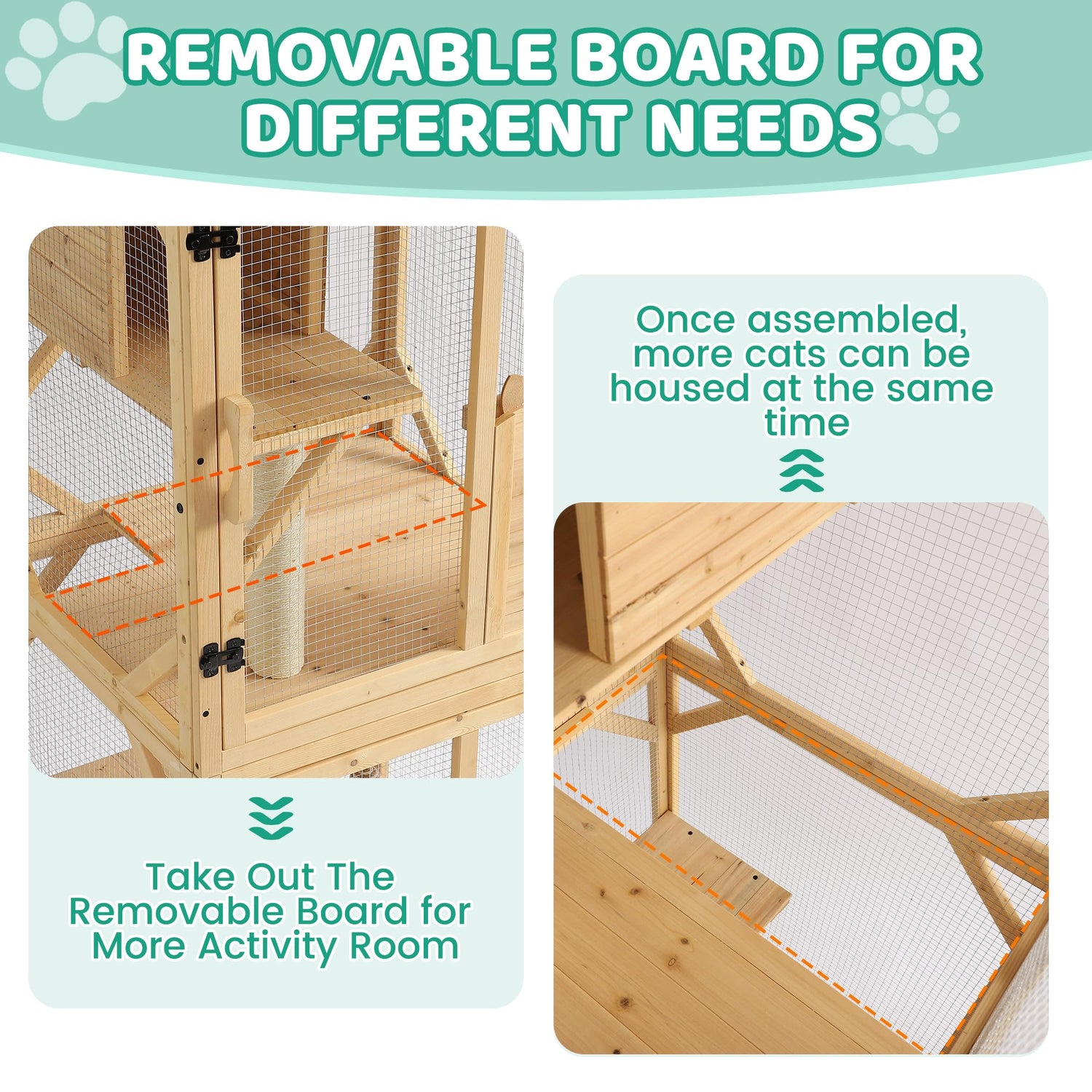 - Ideal House for Furry Pets: Our outdoor cat enclosure includes 3 jumping platforms, 1 removable board, 1 resting box, 1 cat scratching post, 1 sisal ball, 2 lockable doors and 2 small sliding doors for your cat's jumping and playing