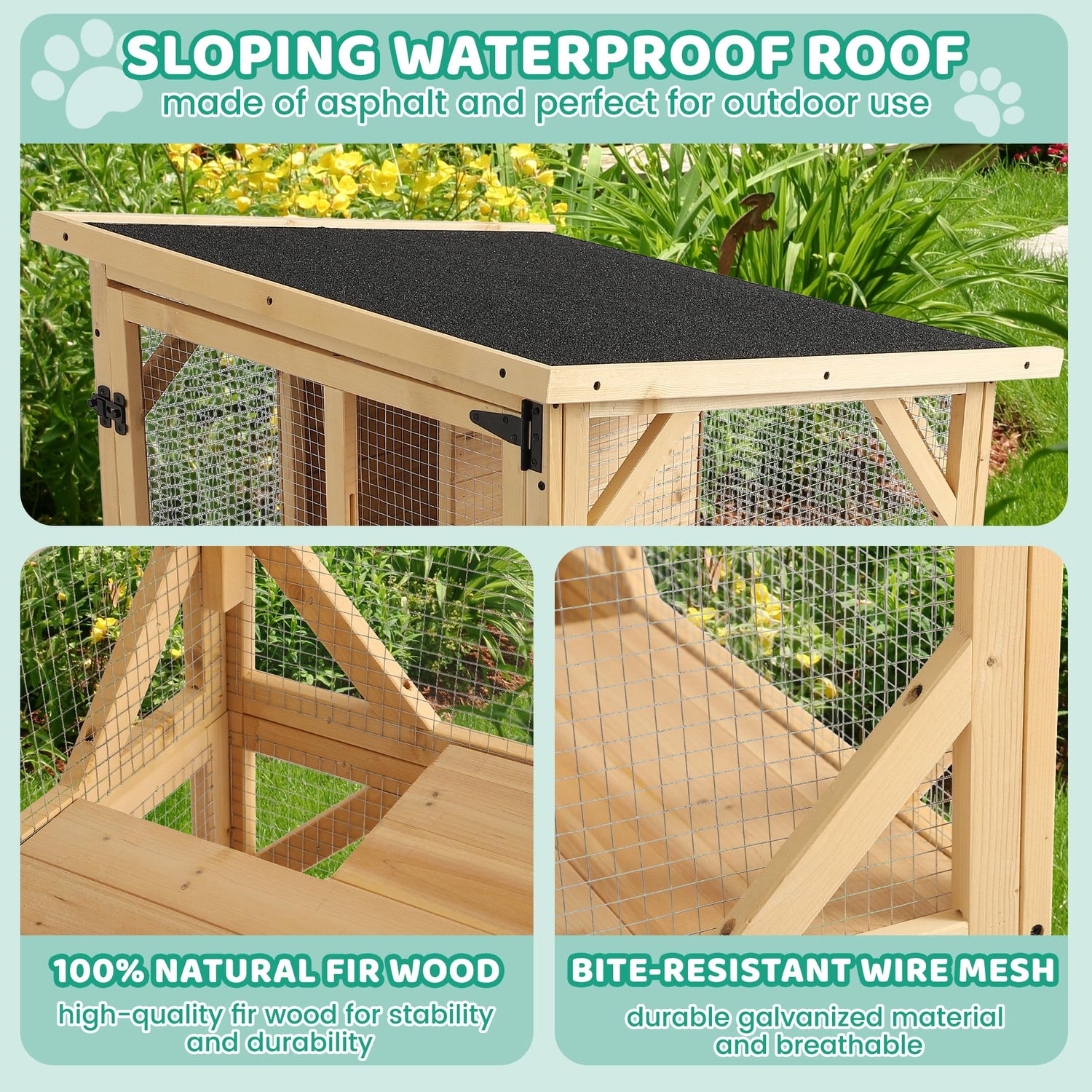 - Sloping Waterproof Roof Design: Crafted with fir wood and bite-resistant galvanized mesh, the cat cage is durable to resist the rain with asphalt waterproof roof. Sloping design can make raindrops fall quickly to keep the cat house dry