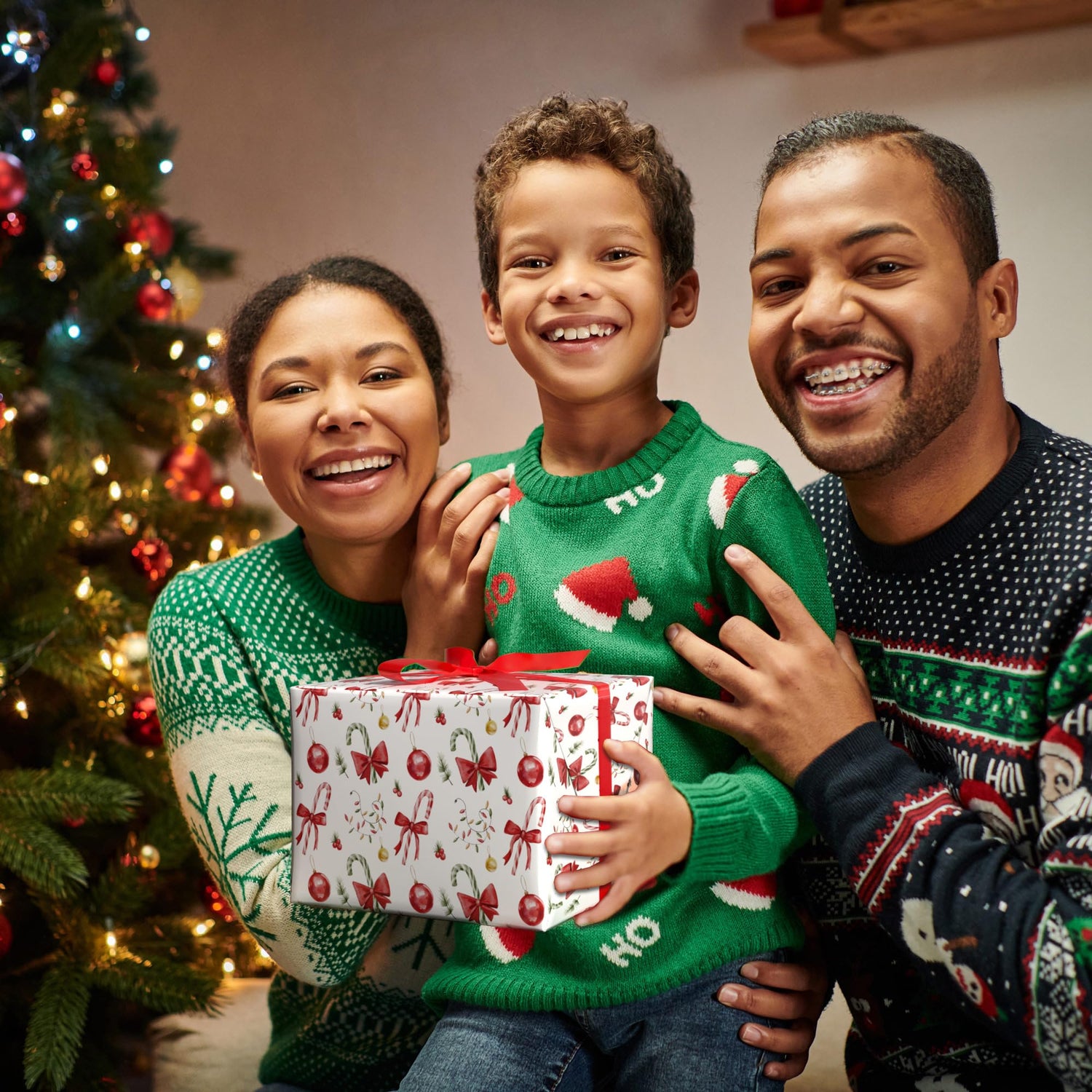 - Cheerful Holiday Design: This Xmas wrapping paper features red bows, striped candy canes, Christmas baubles, gold ornaments, and berry sprigs, creating a fun and festive look.