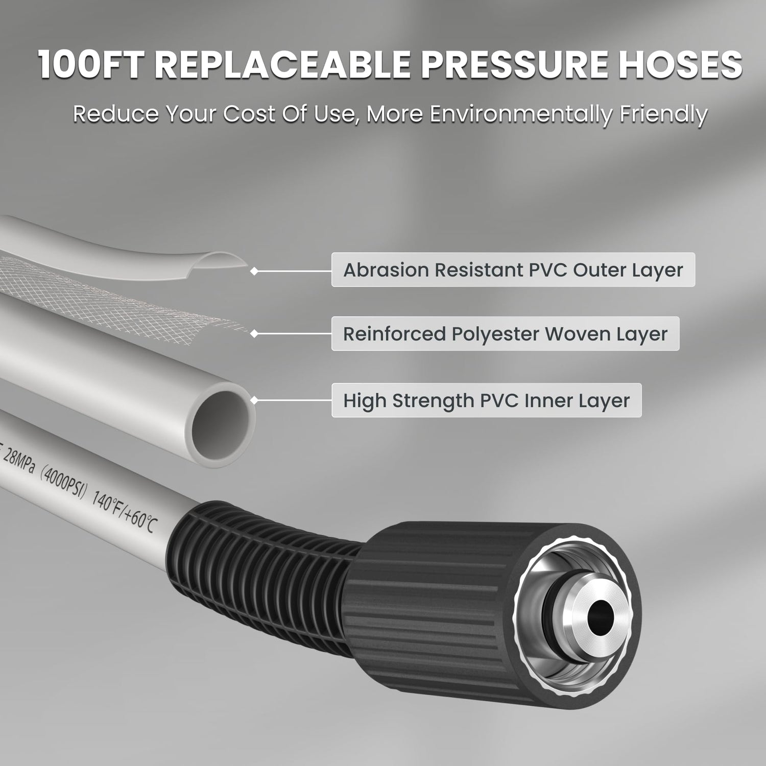 - 100 FT Replaceable Pressure Hose: Giraffe Tools Pressure Washer featuring a 100 ft replaceable hose(32 °F-104 °F). Constructed with three-layer composite anti-explosion material, it's designed to tackle even the toughest cleaning jobs. The detachable hose is for easy recycling and reuse, reducing the amount of product waste