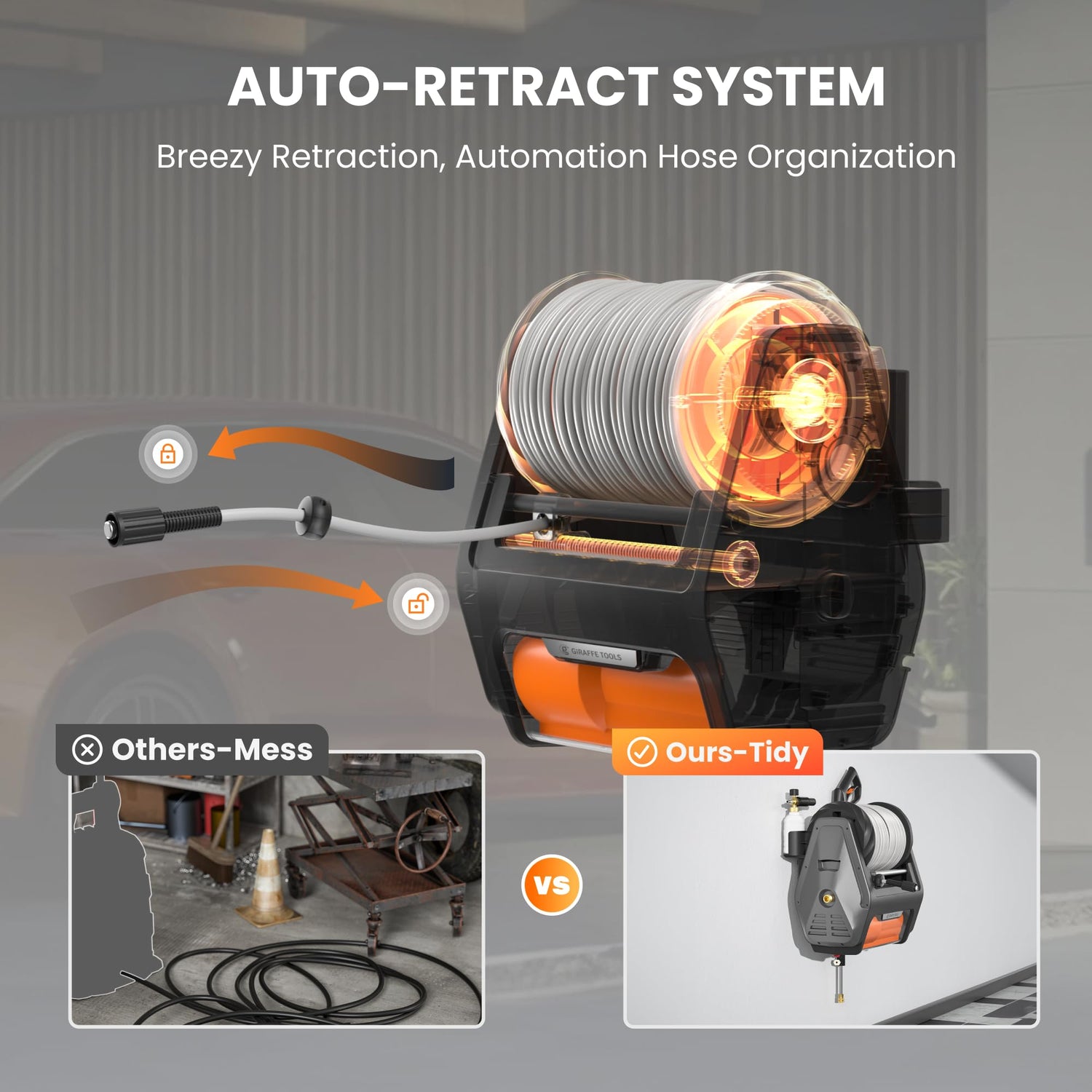 - Stable Auto Rewind: Give the hose a gentle tug, the pressure washer reel will retract automatically back in. The retractable system makes storage easy and is designed to protect the pressure hose from kinks, snags and tears, and makes rewinding and unwinding simple. Save your time and effort