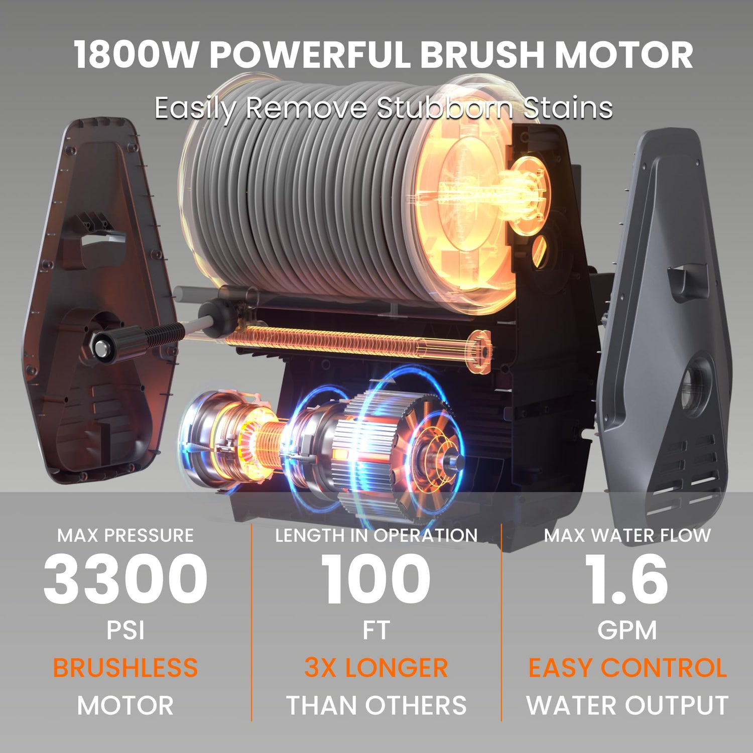 - Powerful 1800 Watt Induction Motor: Generates up to 3300 psi of water pressure and 1.6 gpm of water flow for handling even the most stubborn grime quickly and effortlessly. Tackling tough tasks such as tar, grease, oil stains, rust, and stubborn grime is effortlessly accomplished