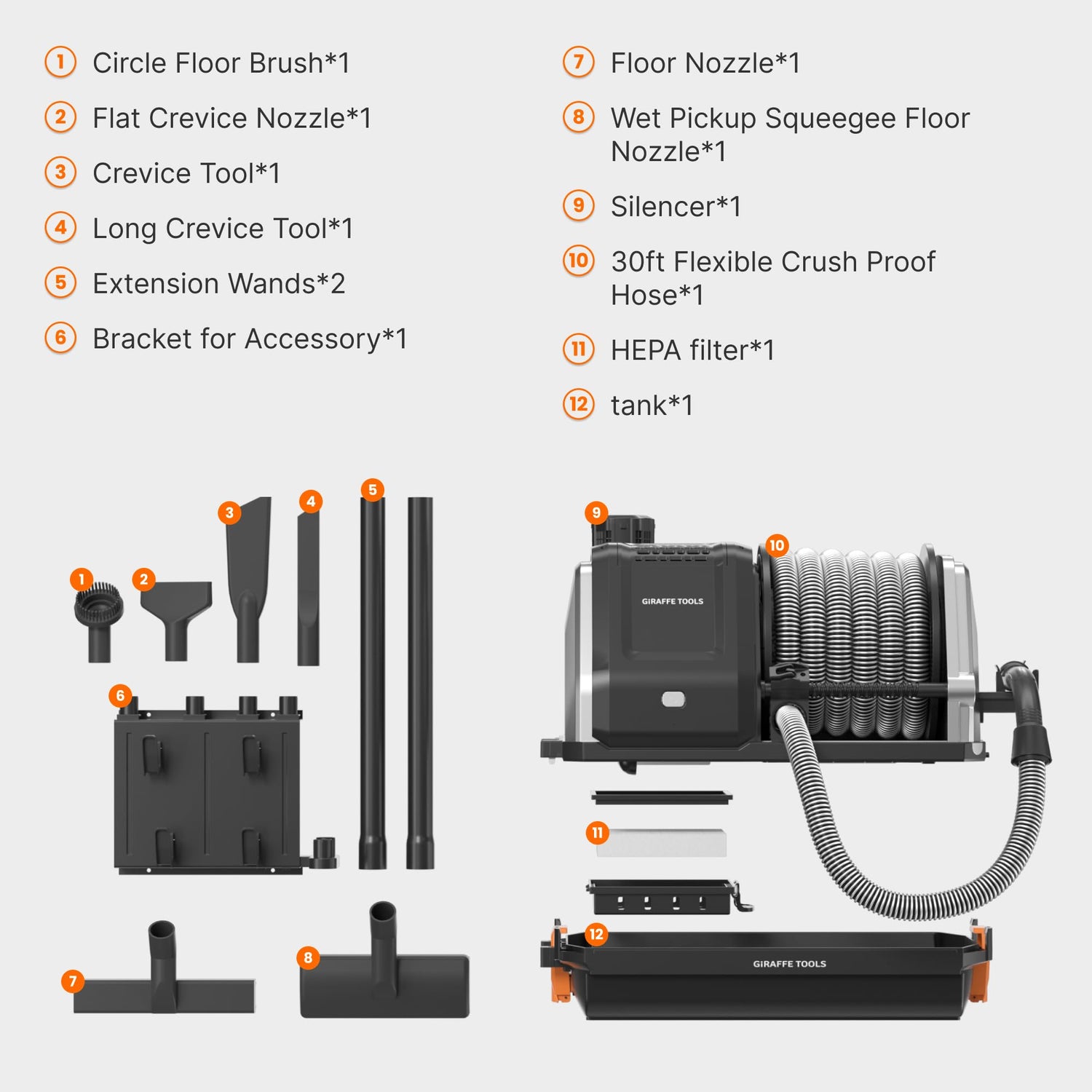 Giraffe Tools Grandstorm Retractable Vacuum Cleaner with 30 FT Hose Wall Mounted, Wet Dry Vacuum Cleaner with 6 Nozzles for Car Detailing Normal Version, Grey (No Remote Control Funtion)
