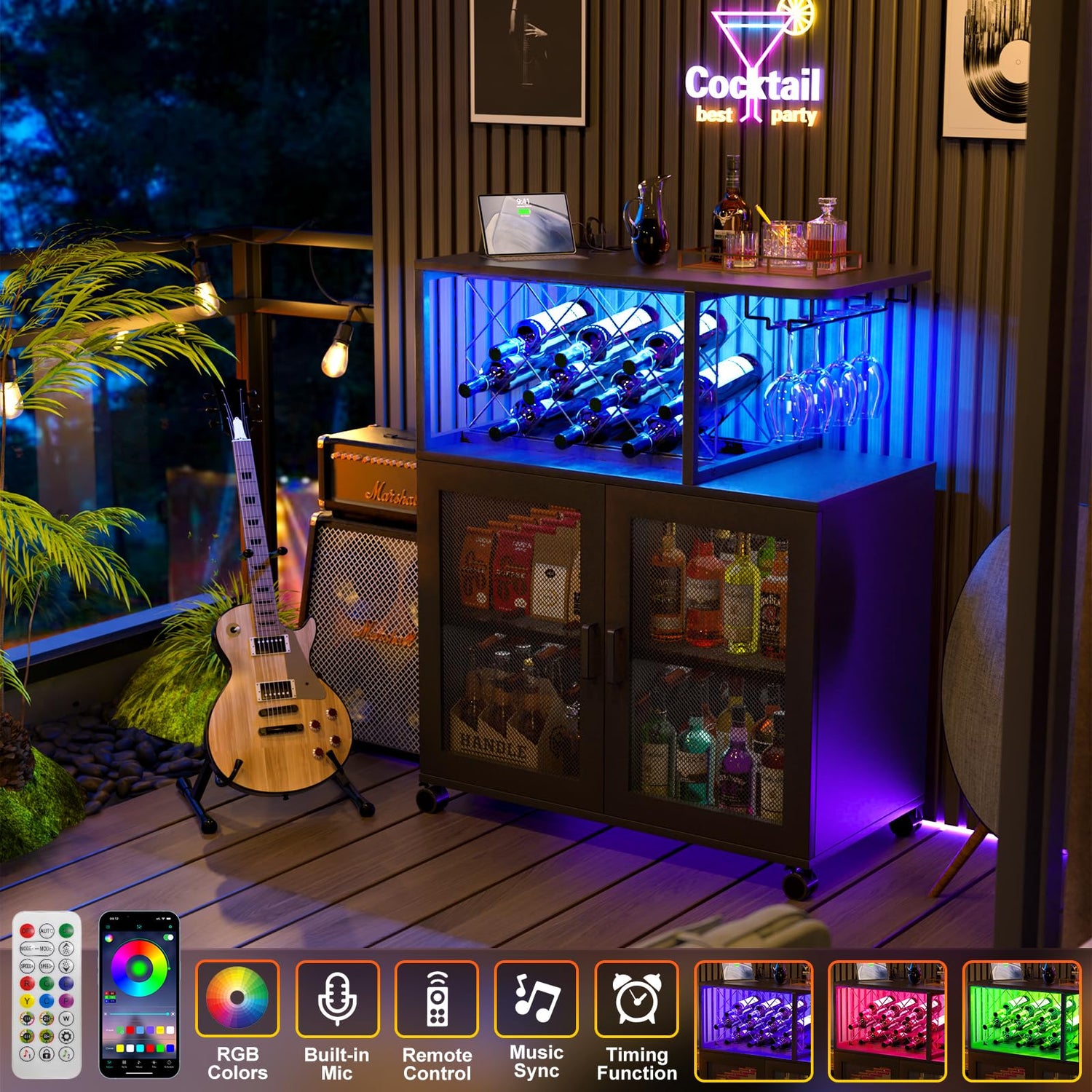 Girapow Small Bar Cart with Wheels, Liquor Cabinet with LED Light, Wine Bar Cabinet with Power Outlets, Home Mini Bar with Wine Rack, Glasses Storage for Kitchen, Dining Room, Living Room, Black
