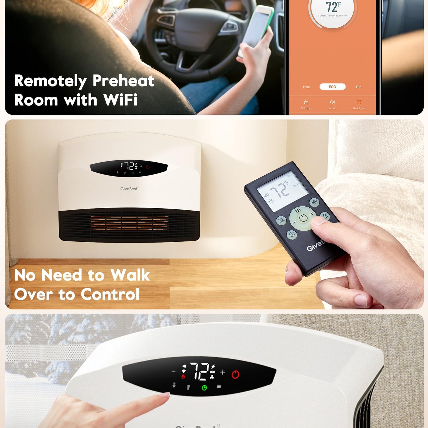 - 【REMOTE, WIFI AND TOUCH CONTROL】Remote Control: The wall mounted heater comes with a remote control, allows you to adjust its settings from a distance. WiFi Control: The wall mount heaters with WiFi control let you to turn on the heater in advance to preheat when you are downstairs. Touch Control: The electric wall heater features an intuitive touch control panel, displays the current temperature and other relevant information for easy monitoring