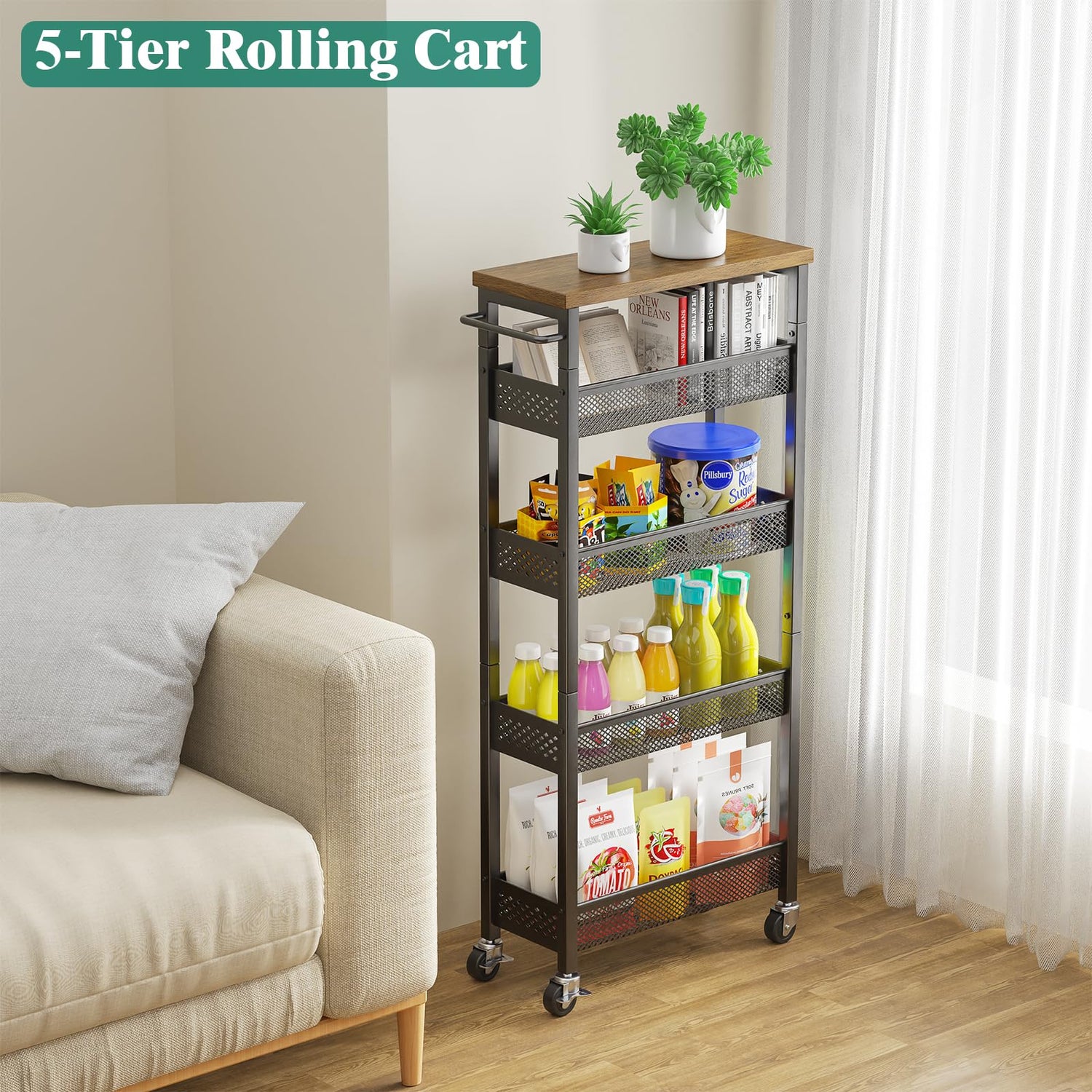 Giwil Slim Storage Cart 5 Tier Narrow Kitchen Rolling Cart on Wheels for Small Space, Metal Utility Cart Narrow Bathroom Storage Cabinet Mobile Shelf Unit Organizer with Wood Top and Handle, Black
