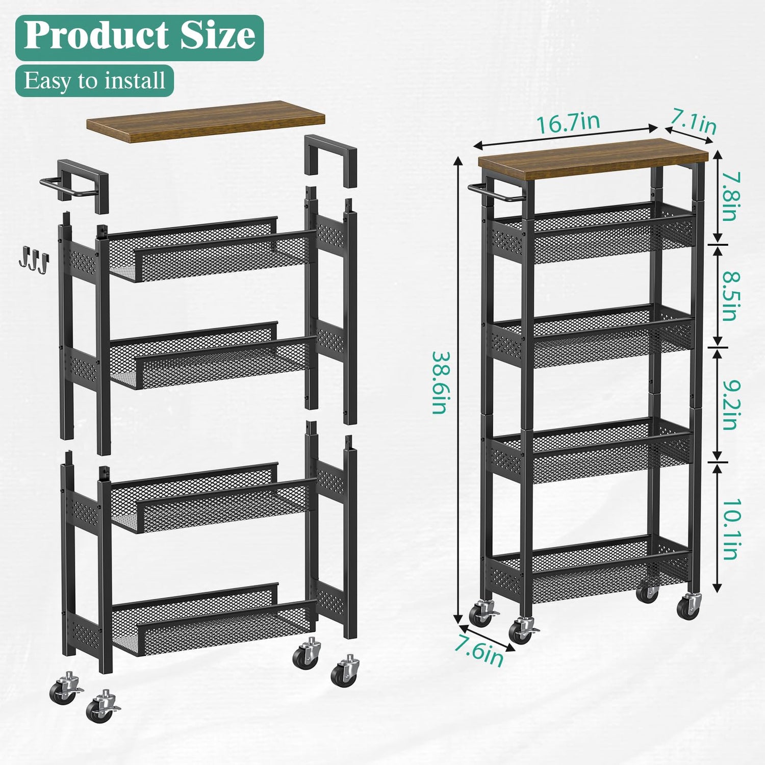 - [Easy Assembly]: The slim kitchen organizer cart we come with the necessary installation tools and instructions, you can complete the assembly within just 25 minutes. Measures 16.54"D x 7.1"W x 38.58"H high when assembled