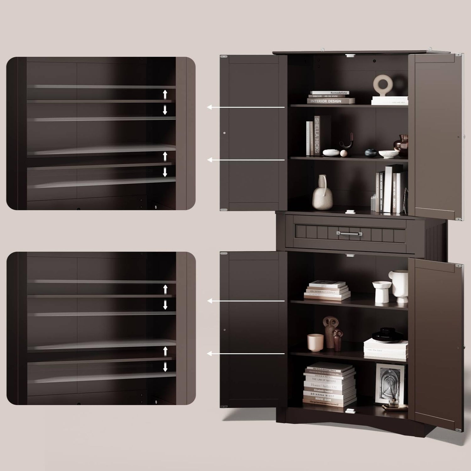 - 【Safe and Flexible Design】 The tall storage cabinet features 4 adjustable partitions and a large-capacity drawer. Kitchen cupboard each shelf can be adjusted to 3 different heights to allow you to store items of different heights. Each shelf can bear a maximum load of 60 pounds. The magnetic suction prevents the cabinet door from being easily opened and protects items from falling, and the anti-tip device keeps the cabinet stable.